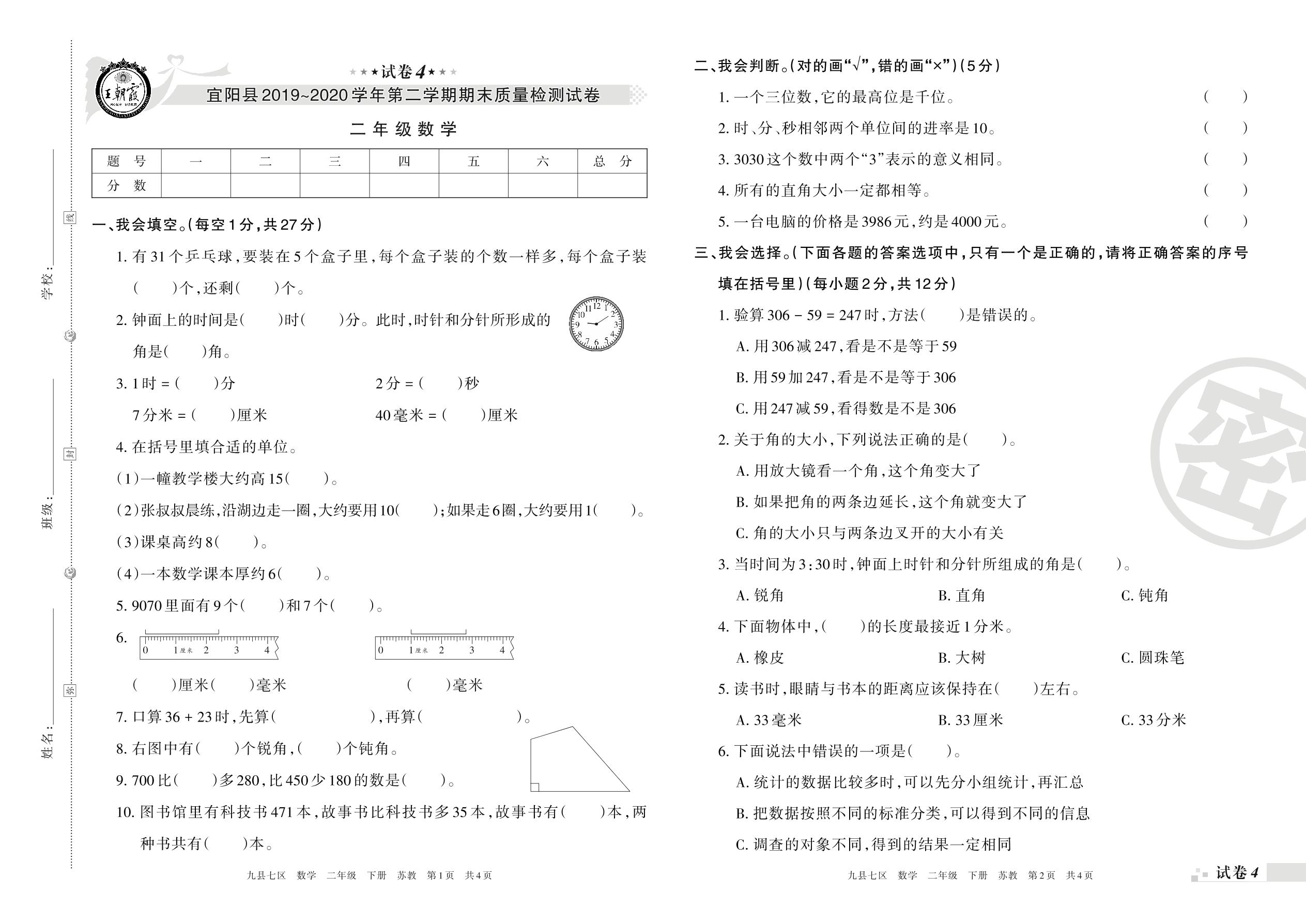 2019-2020学年第二学期洛阳市宜阳县二年级数学试卷(苏教版)【4】