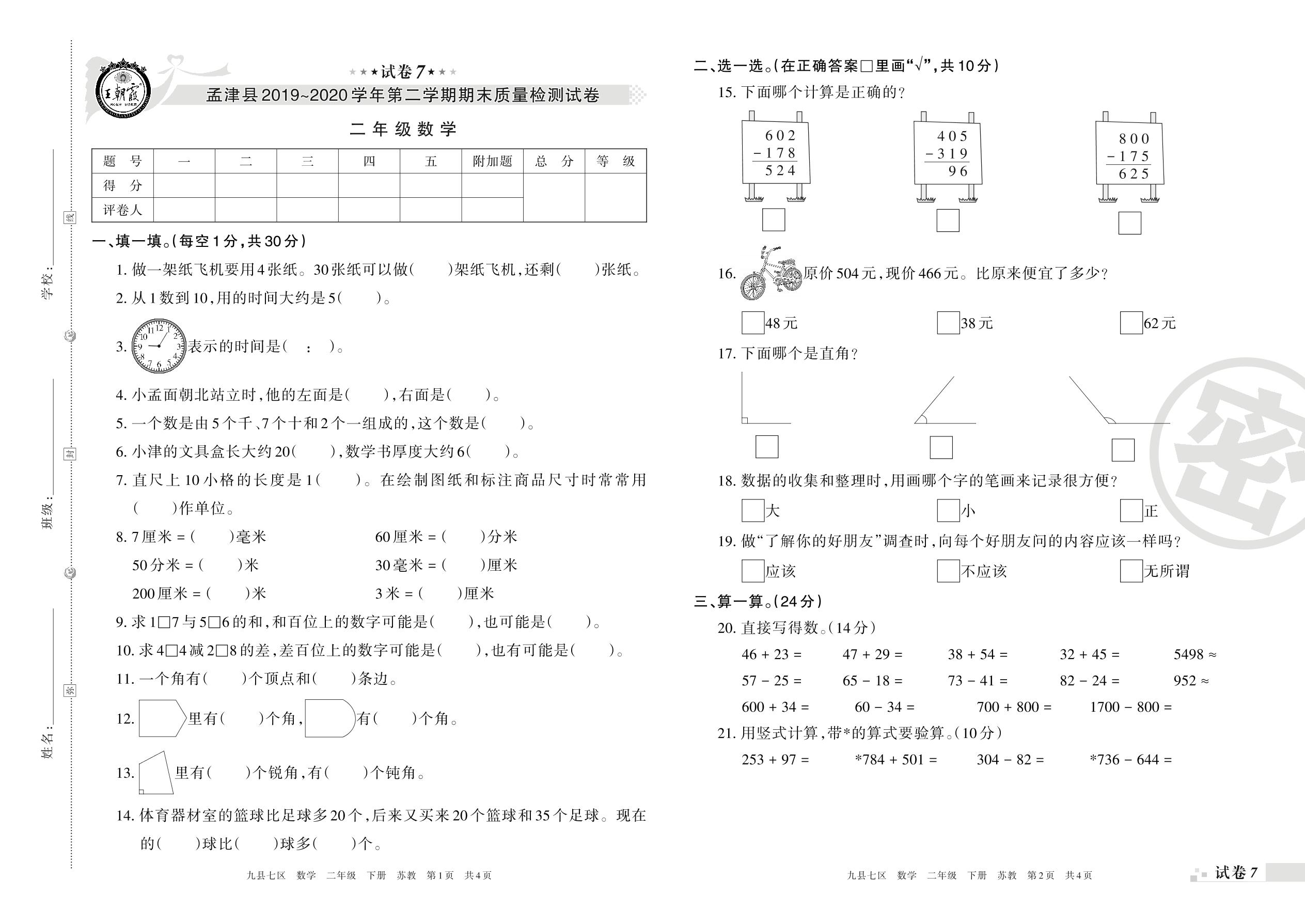 2019-2020学年第二学期洛阳市孟津县二年级数学试卷(苏教版)【7】