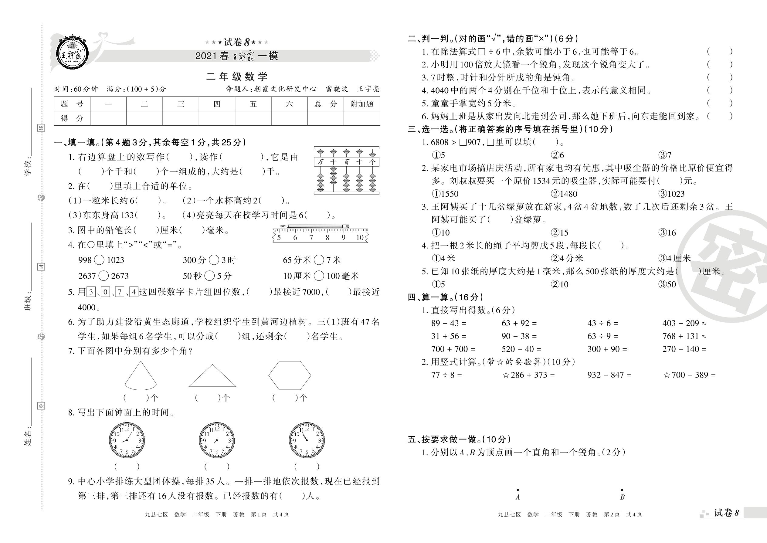 王朝霞期末模拟卷二年级下册数学(苏教版)_R21080382525【8】
