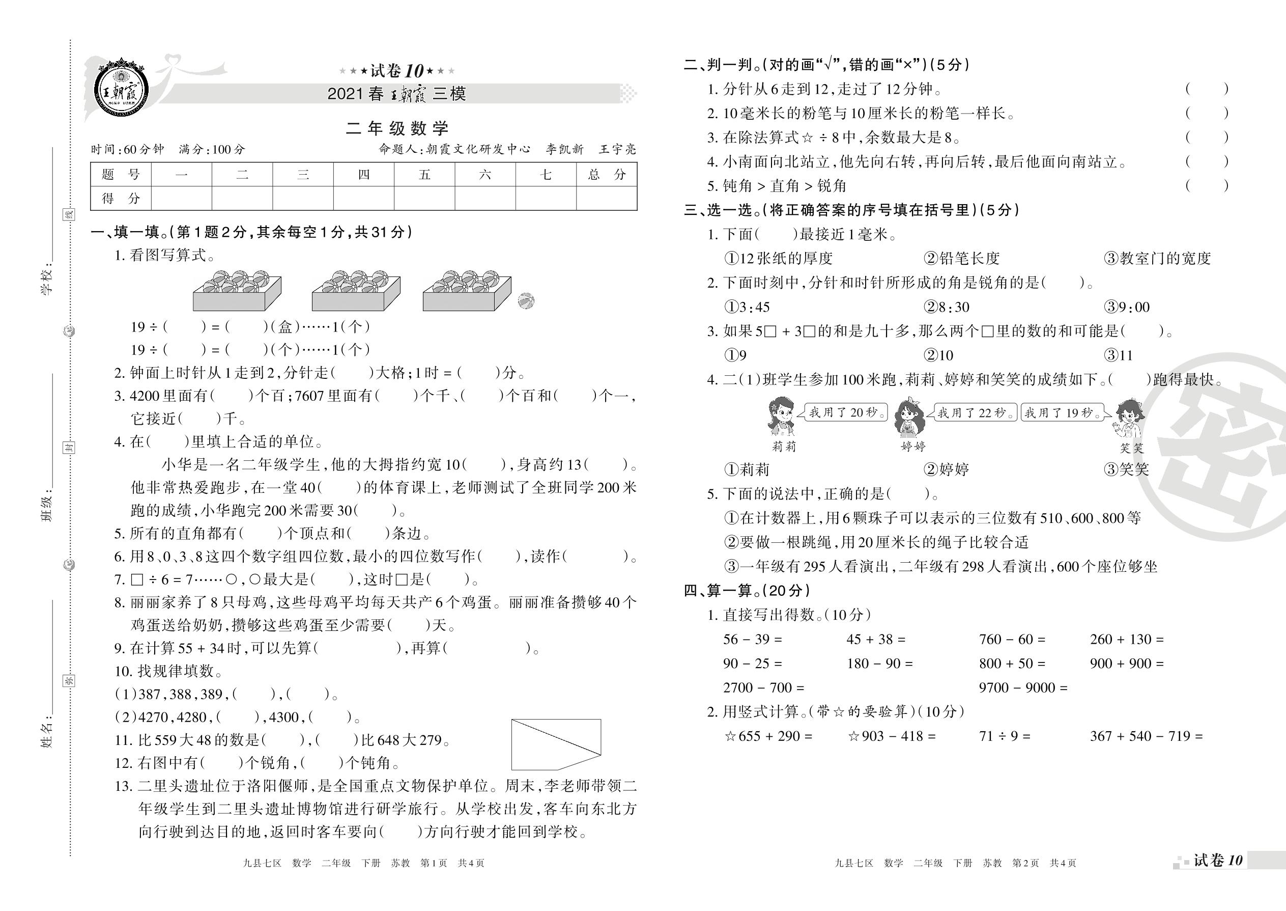王朝霞期末模拟卷二年级下册数学(苏教版)_R21080382533【10】