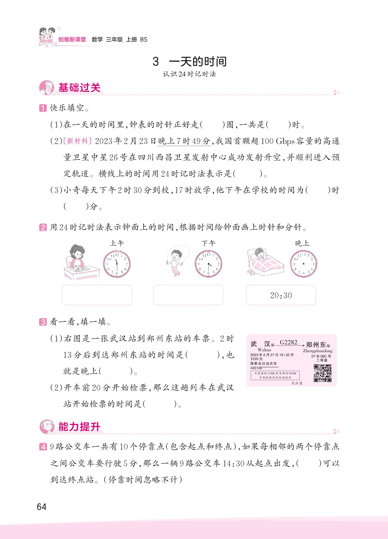 2023上册三年级数学北师版 七 年、月、日——3 一天的时间