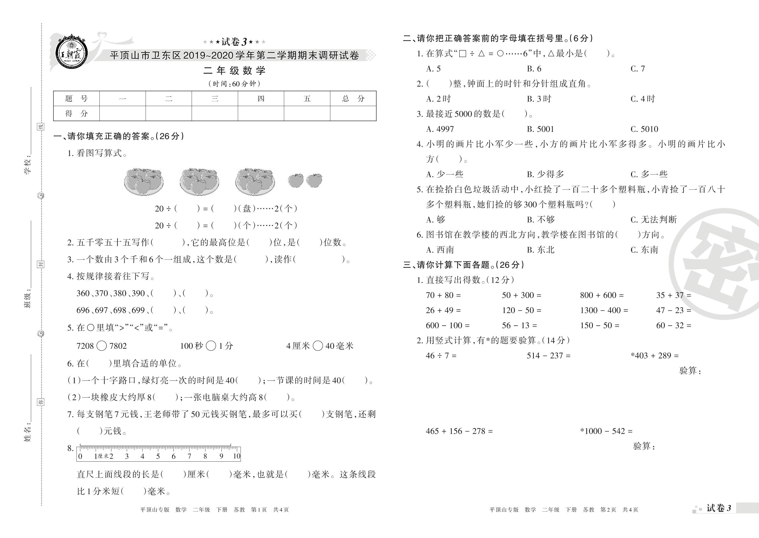2019-2020学年第二学期平顶山市卫东区二年级数学试卷(苏教版)【3】