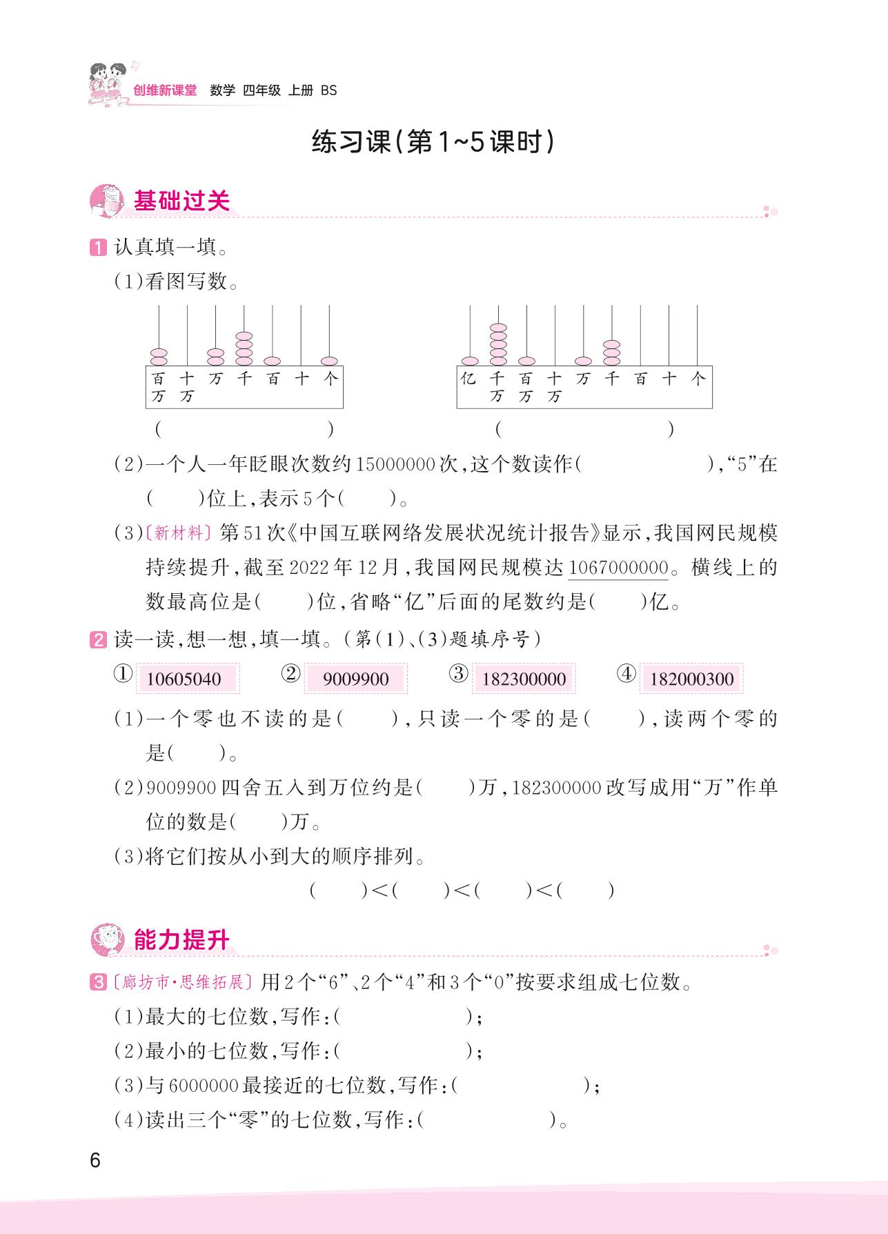 2023上册四年级数学北师版 一 认识更大的数——练习课(第1~5课时)