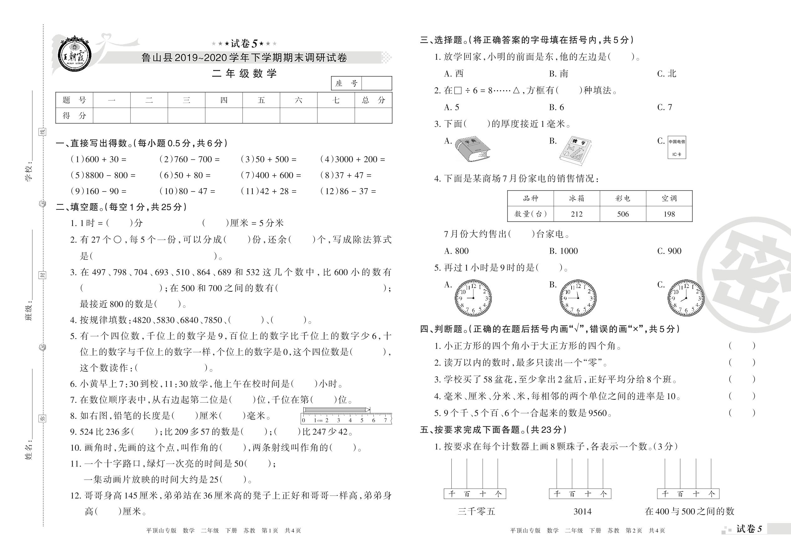 二年级数学苏教版下册期末卷