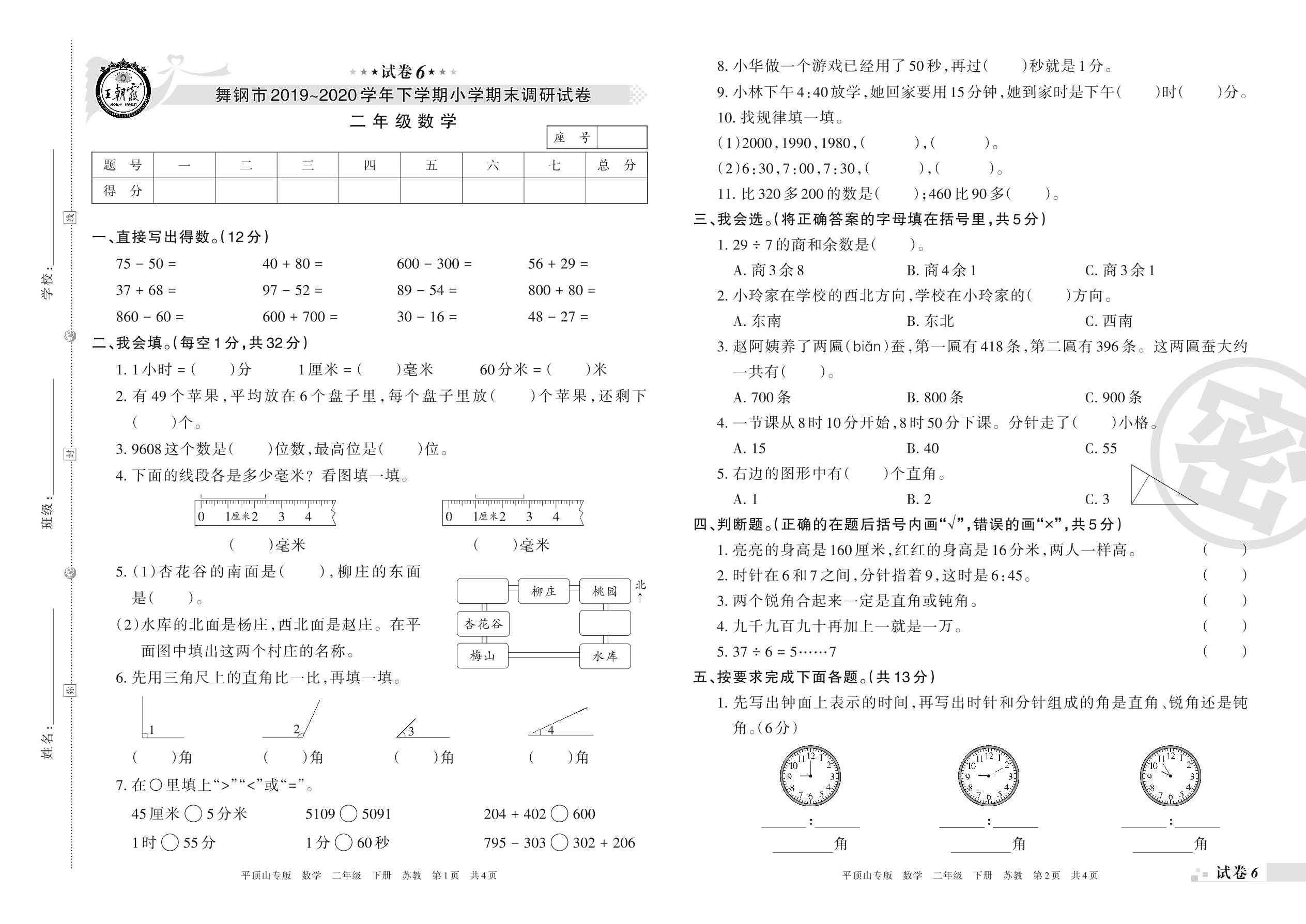 2019-2020学年第二学期舞钢市二年级数学试卷(苏教版)【6】