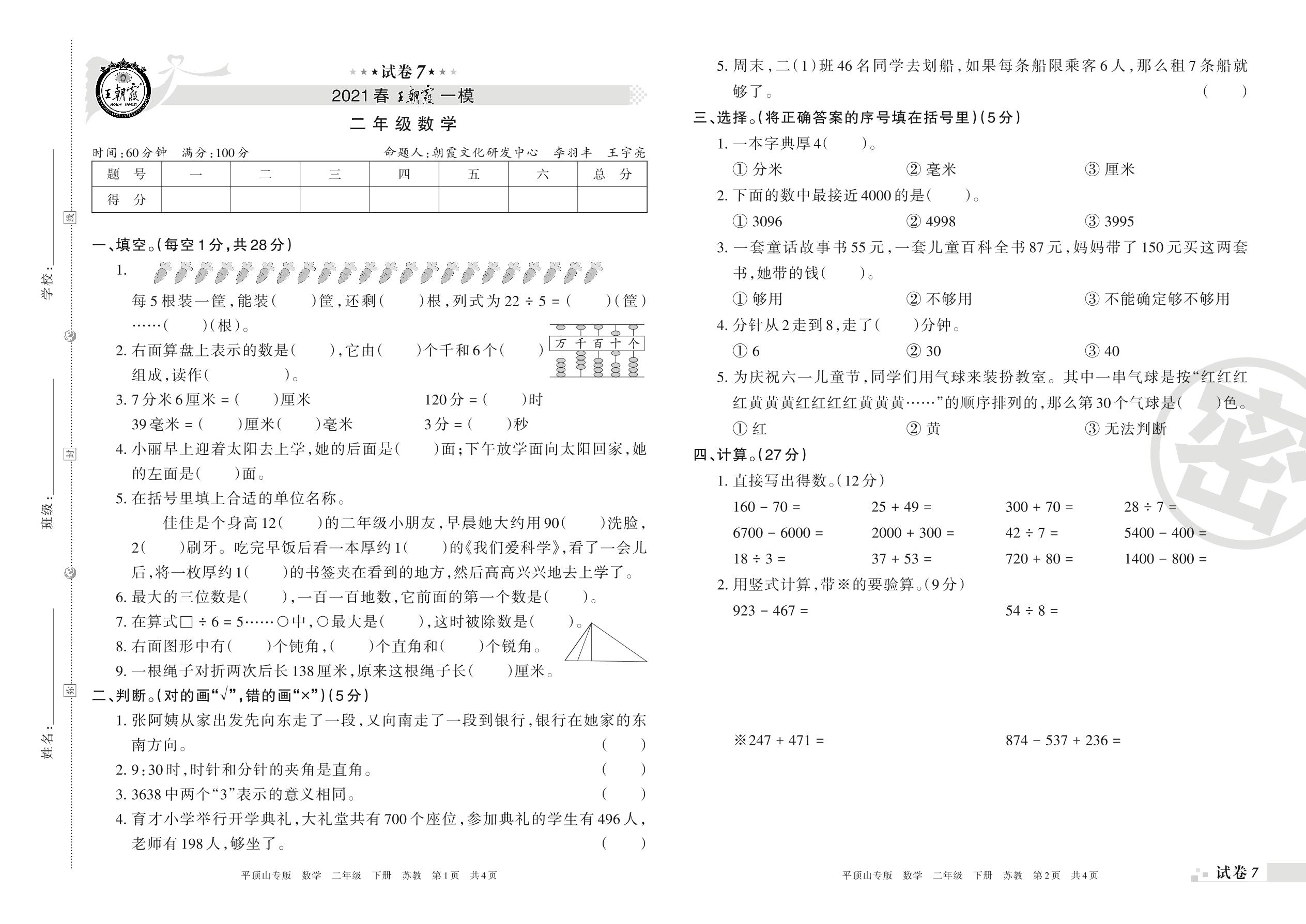 王朝霞期末模拟卷二年级下册数学(苏教版)_R21080382624【7】