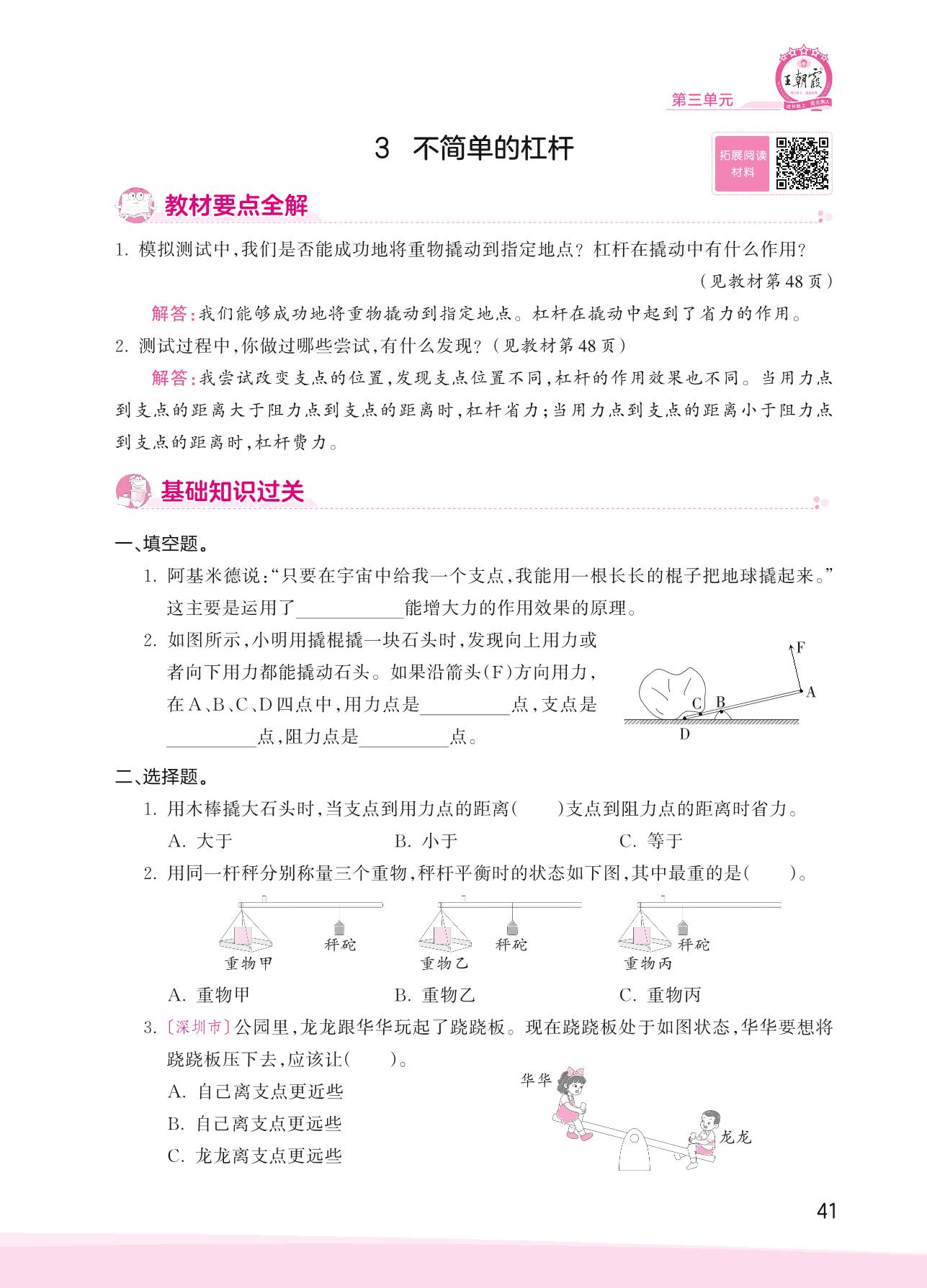 2023上册六年级科学教科版 第三单元 工具与技术——3 不简单的杠杆