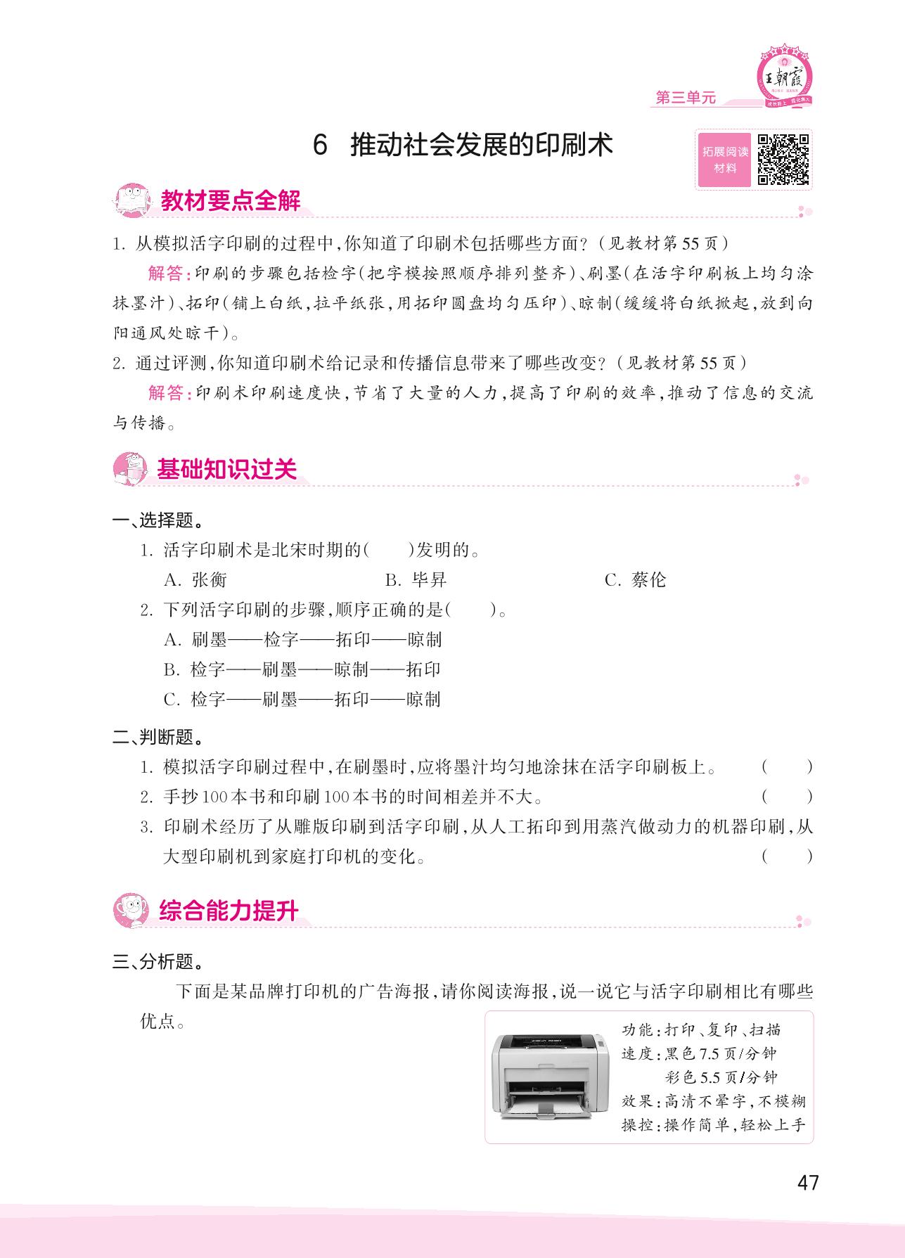 2023上册六年级科学教科版 第三单元 工具与技术——6 推动社会发展的印刷术