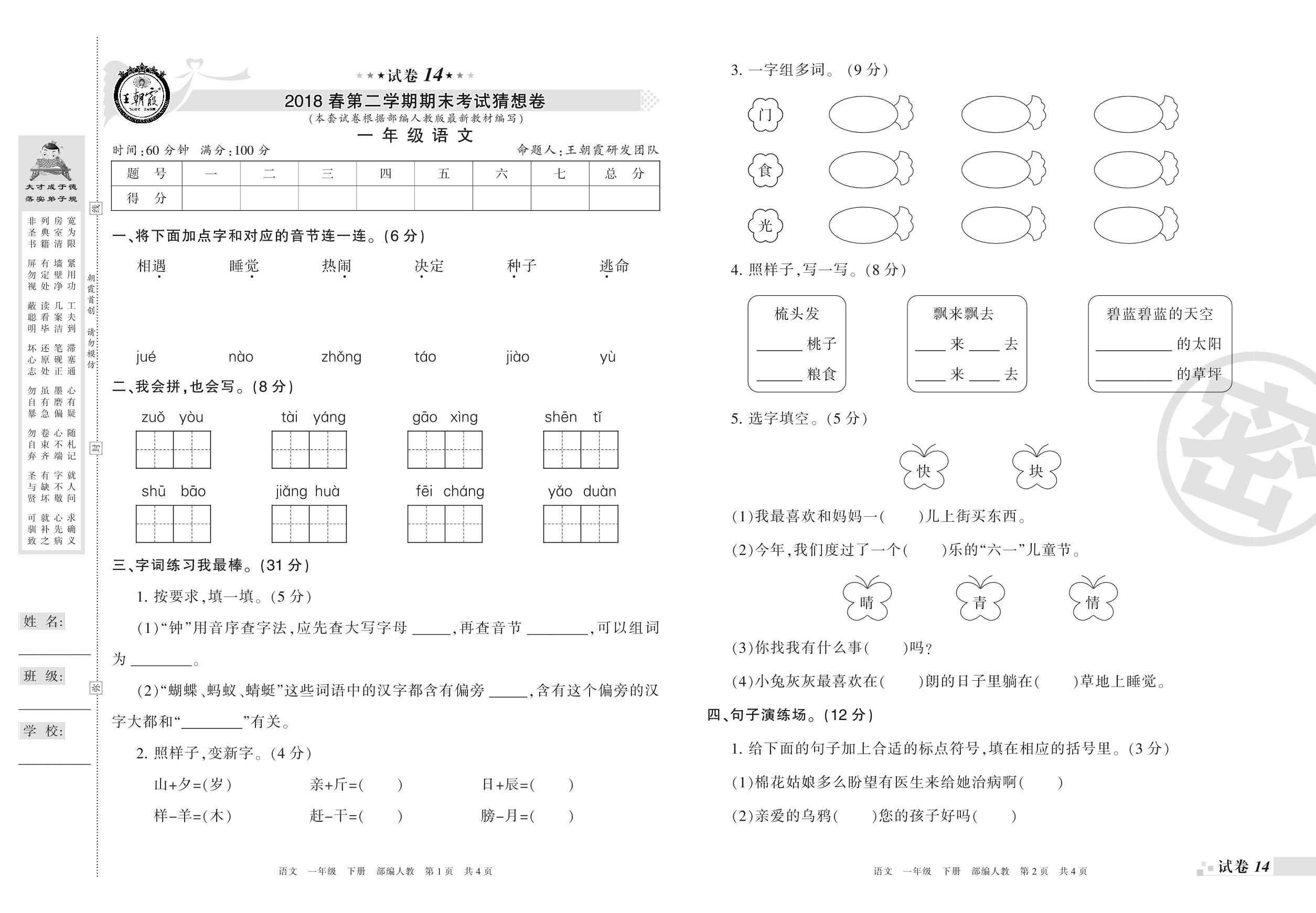 王朝霞期末猜想卷一年级下册语文(人教版)【14】