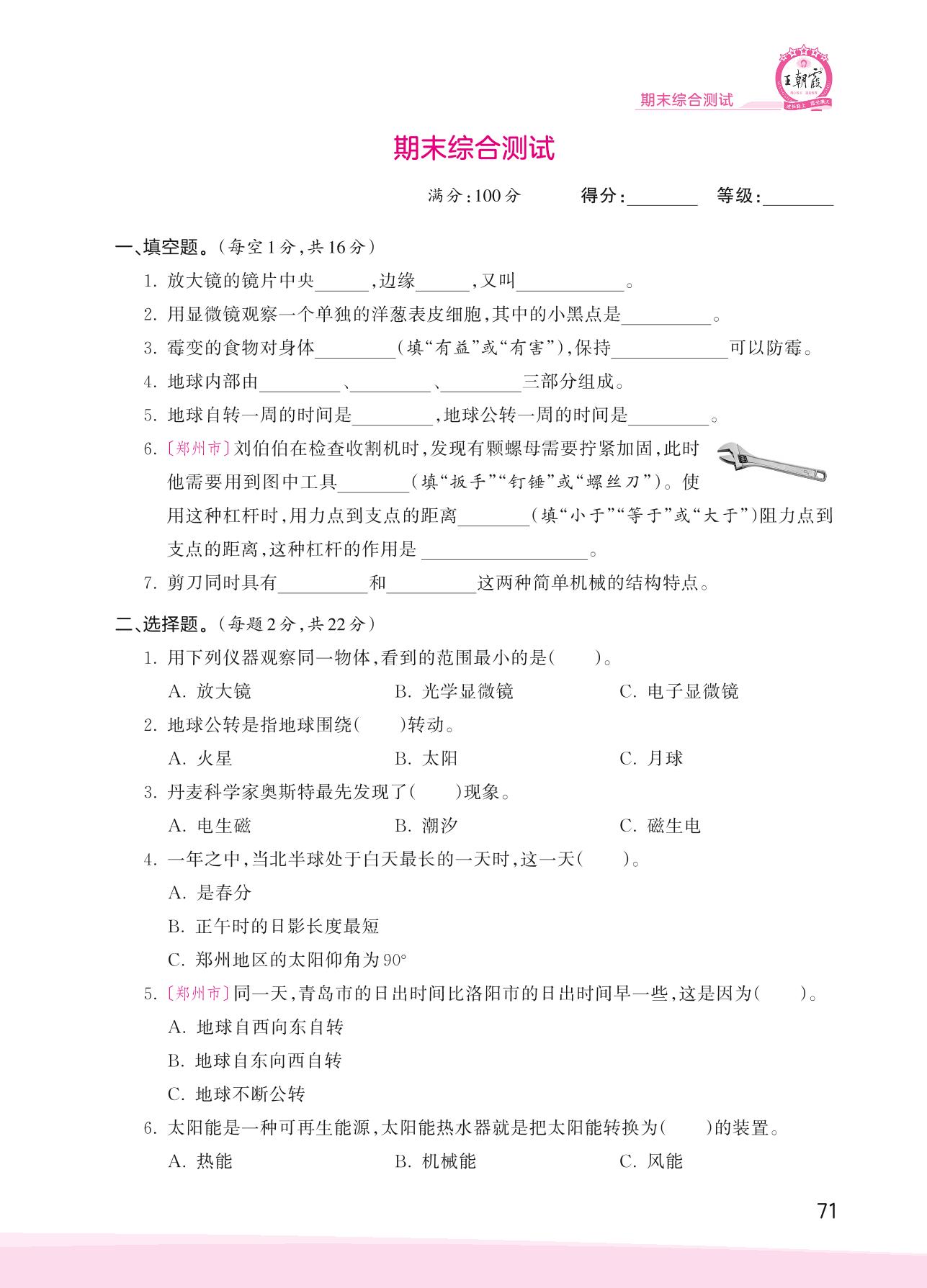 2023上册六年级科学教科版 期末综合测试