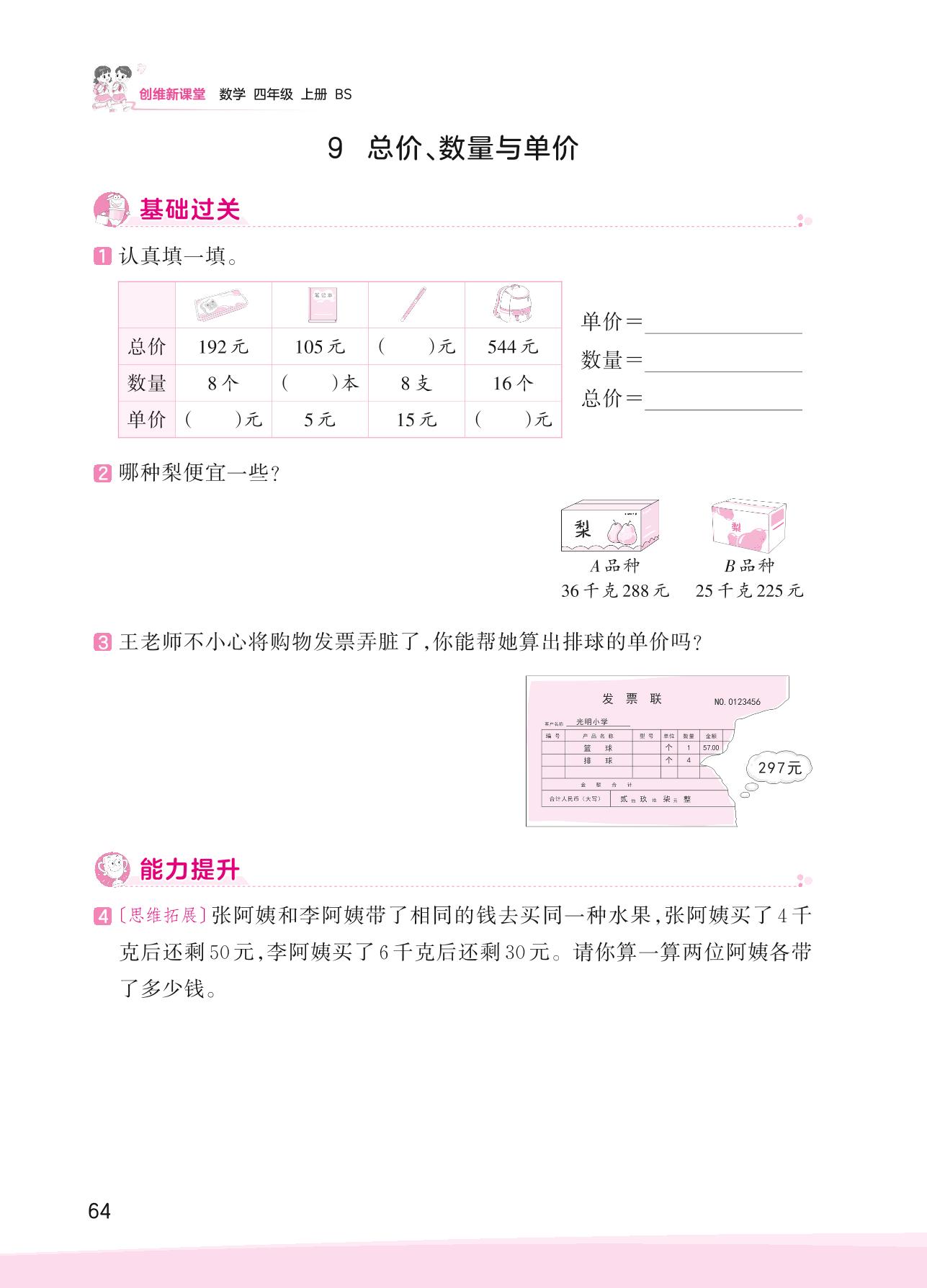 2023上册四年级数学北师版 六 除法——9 总价、数量与单价