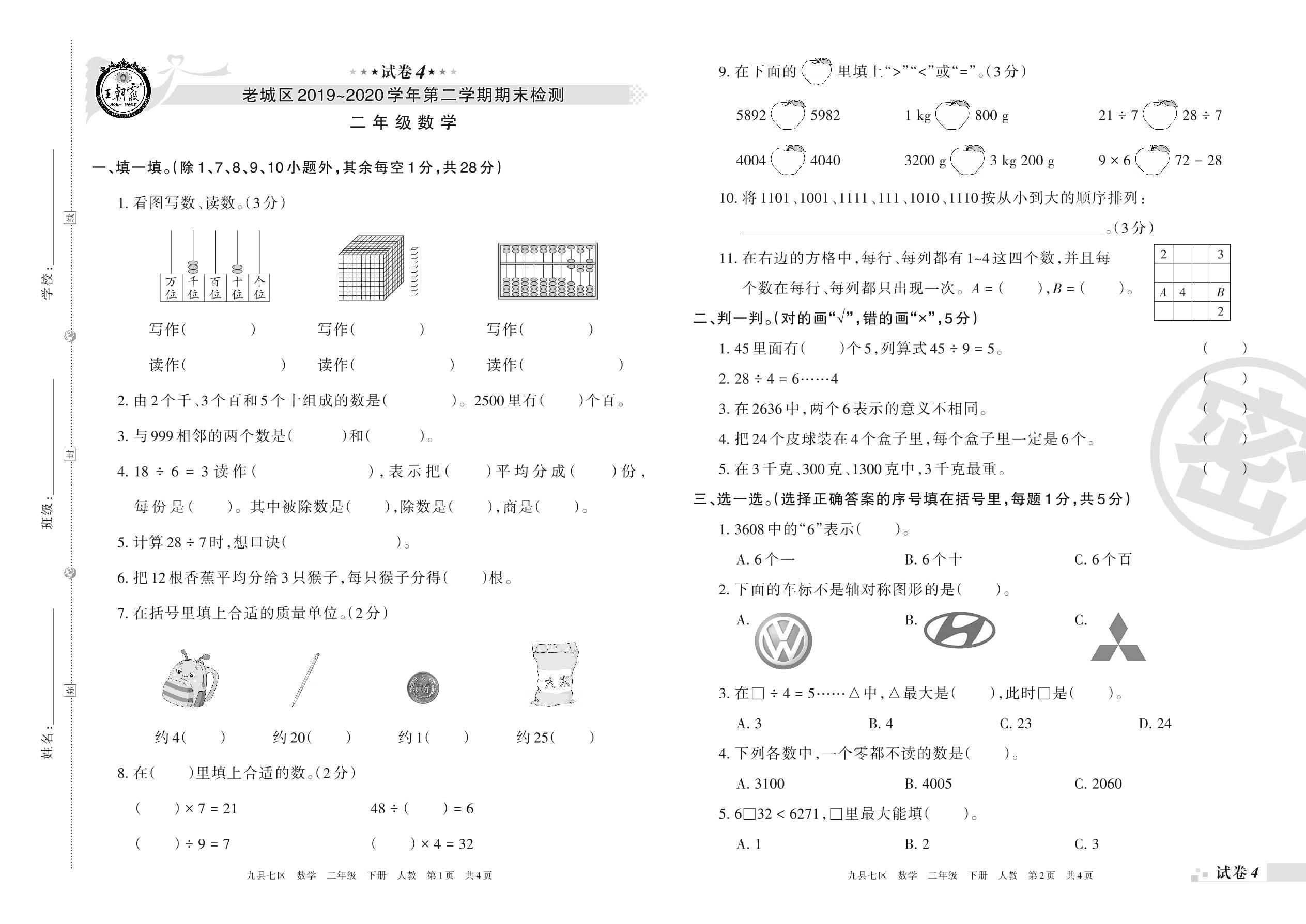 2019-2020学年第二学期洛阳市老城区二年级数学试卷(人教版)【4】