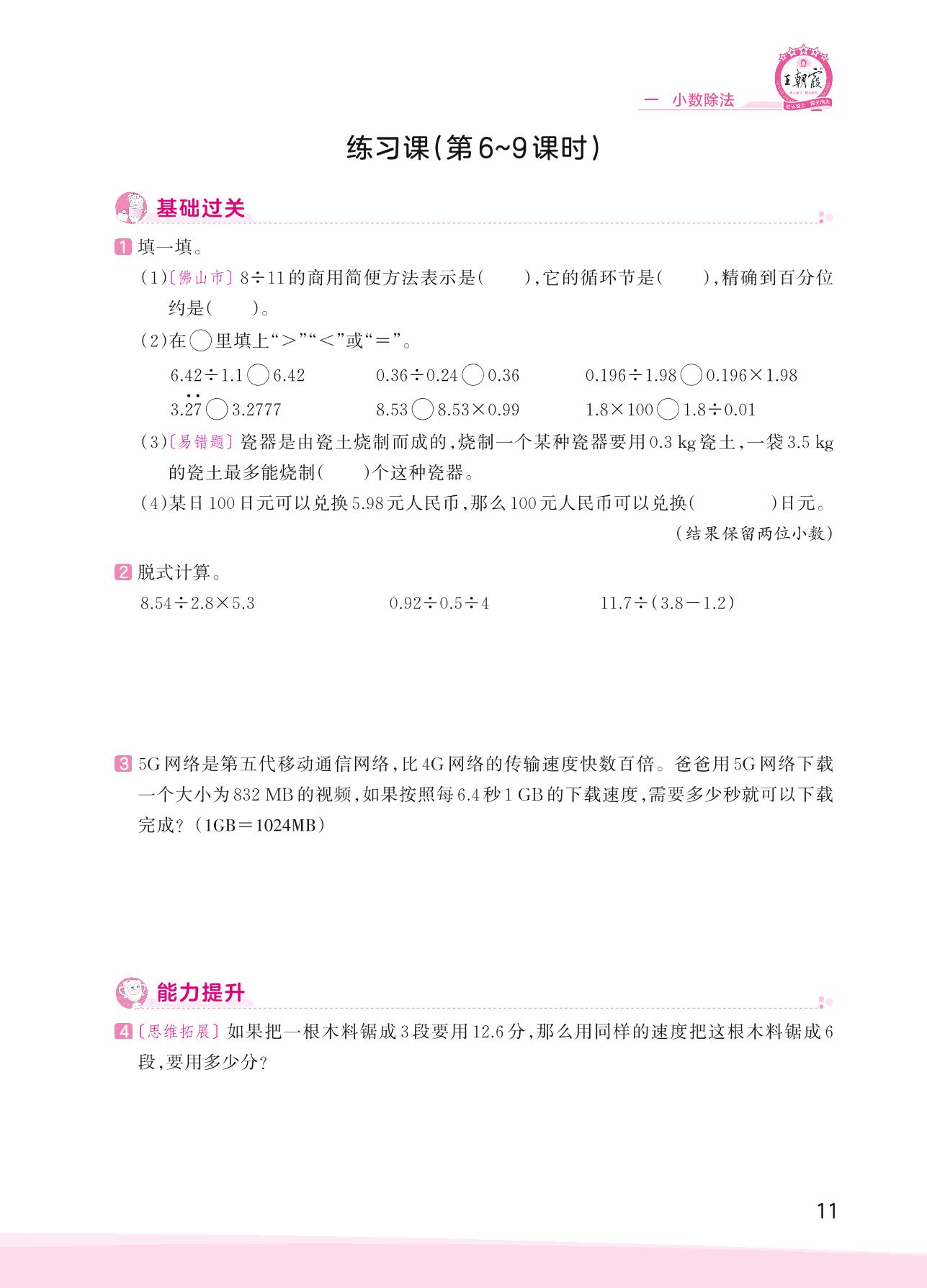 2023上册五年级数学北师版 一 小数除法——练习课(第6~9课时)