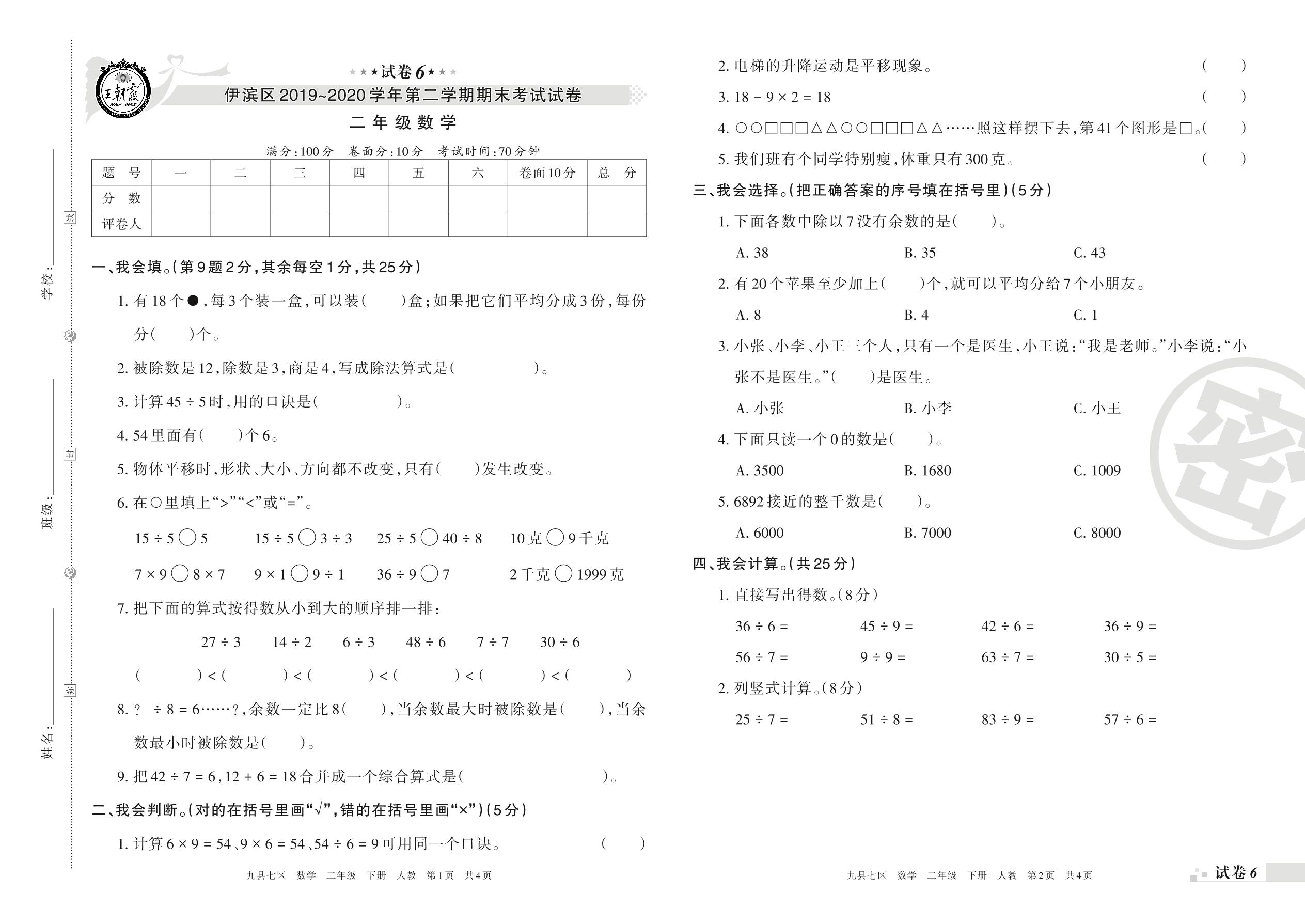 2019-2020学年第二学期洛阳市伊滨区二年级数学试卷(人教版)【6】
