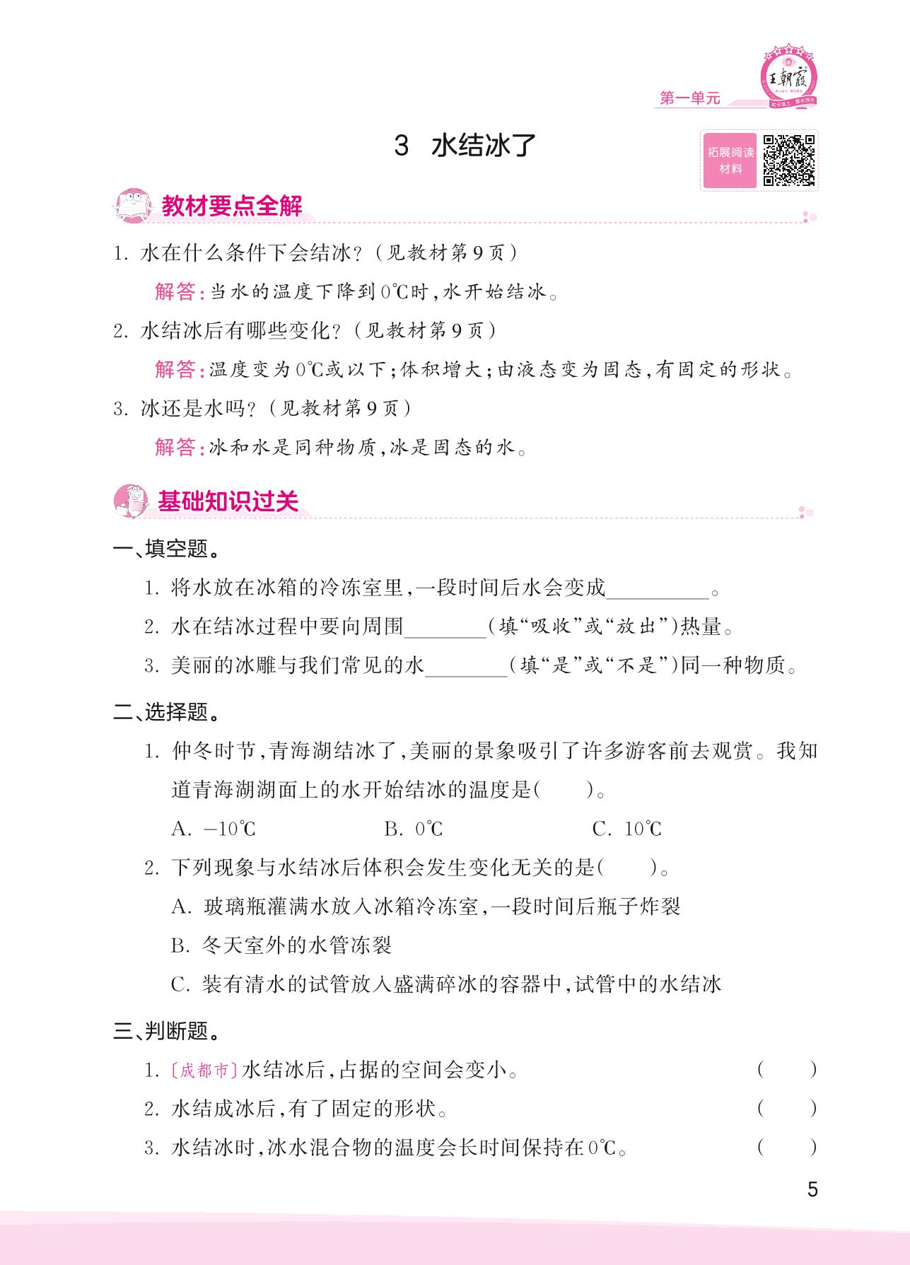 2023上册三年级科学教科版 第一单元 水——3 水结冰了