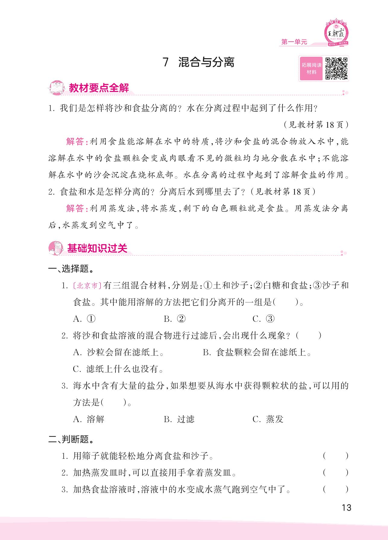 2023上册三年级科学教科版 第一单元 水——7 混合与分离