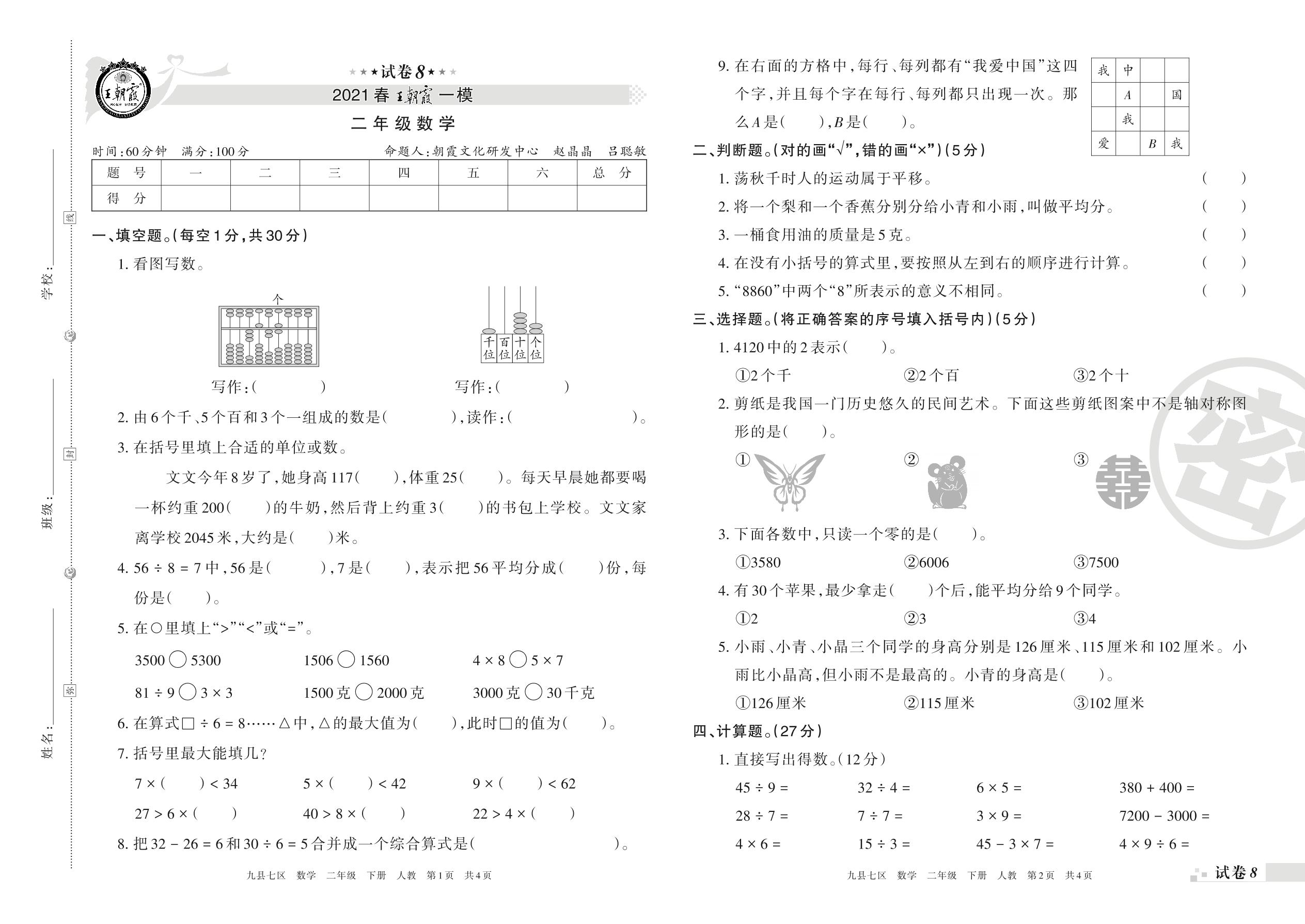 王朝霞期末模拟卷二年级下册数学(人教版)_R21080382704【8】
