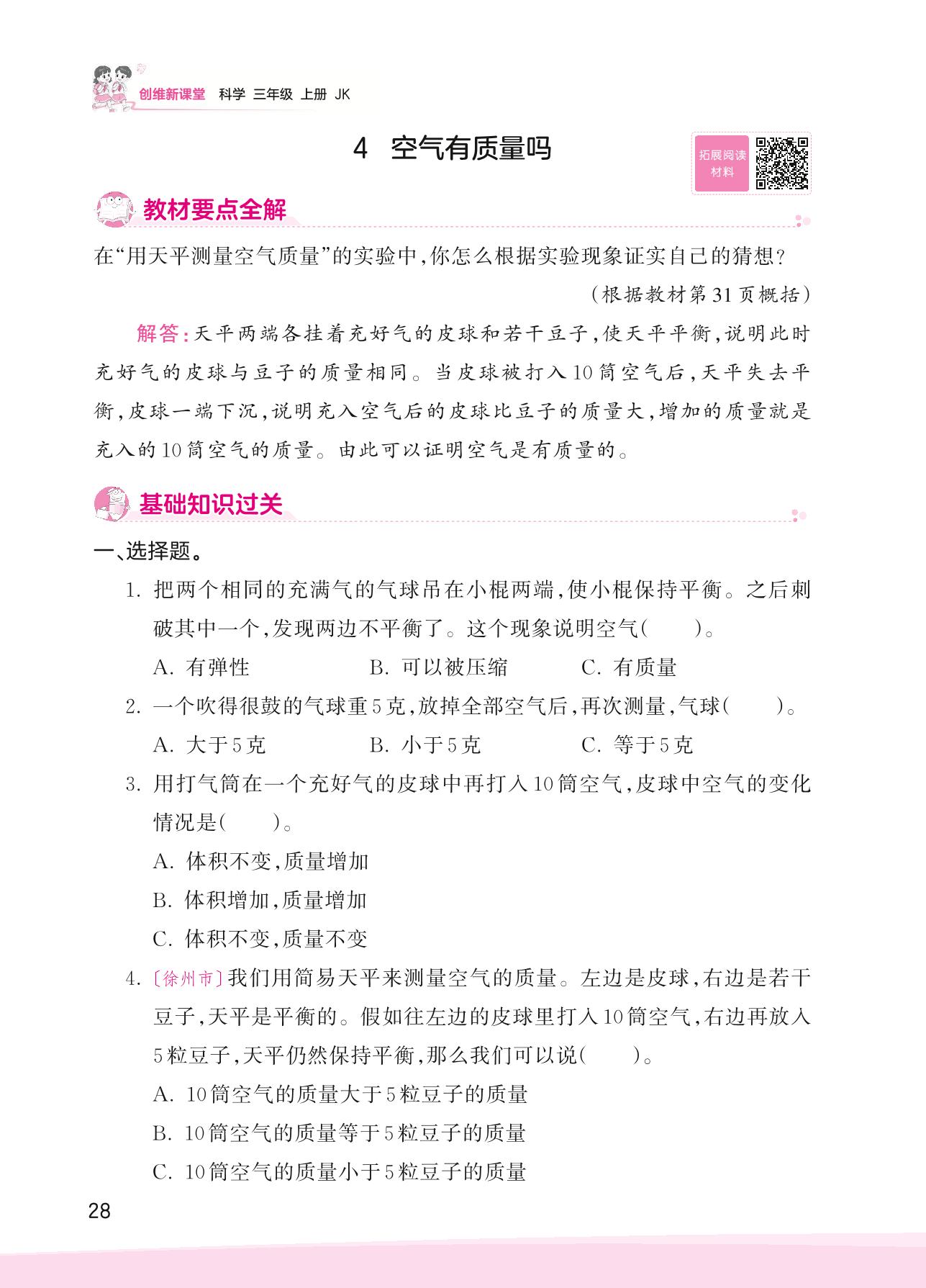 2023上册三年级科学教科版 第二单元 空气——4 空气有质量吗