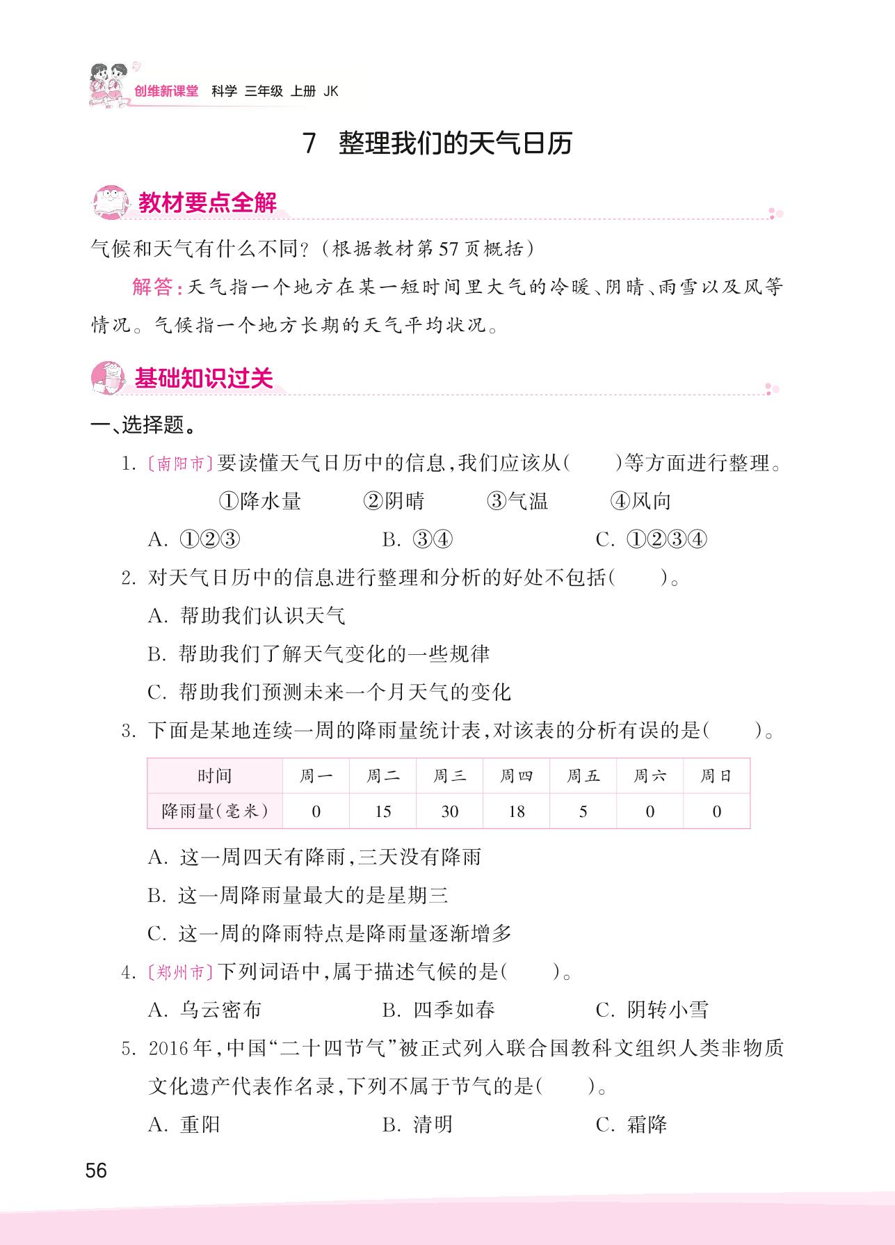 2023上册三年级科学教科版 第三单元 天气——7 整理我们的天气日历