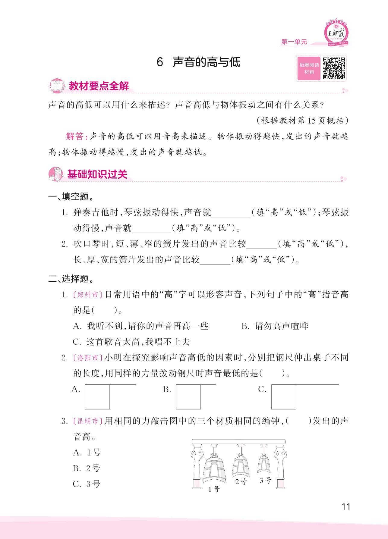 2023上册四年级科学教科版 第一单元 声音——6 声音的高与低