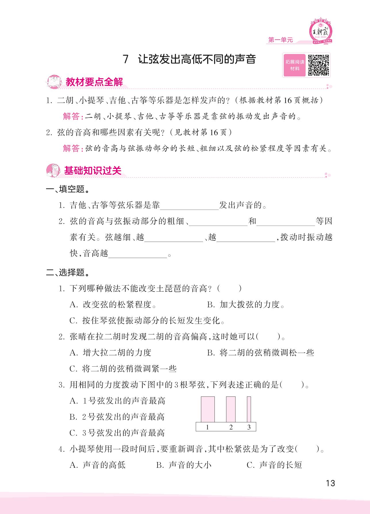 2023上册四年级科学教科版 第一单元 声音——7 让弦发出高低不同的声音