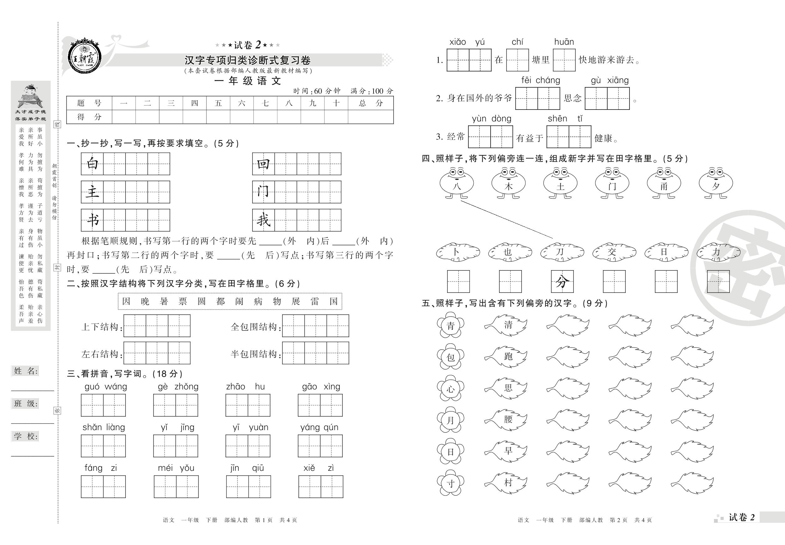王朝霞期末专项卷——汉字专项归类诊断式复习卷一年级下册语文(人教版)_R210731191017【2】