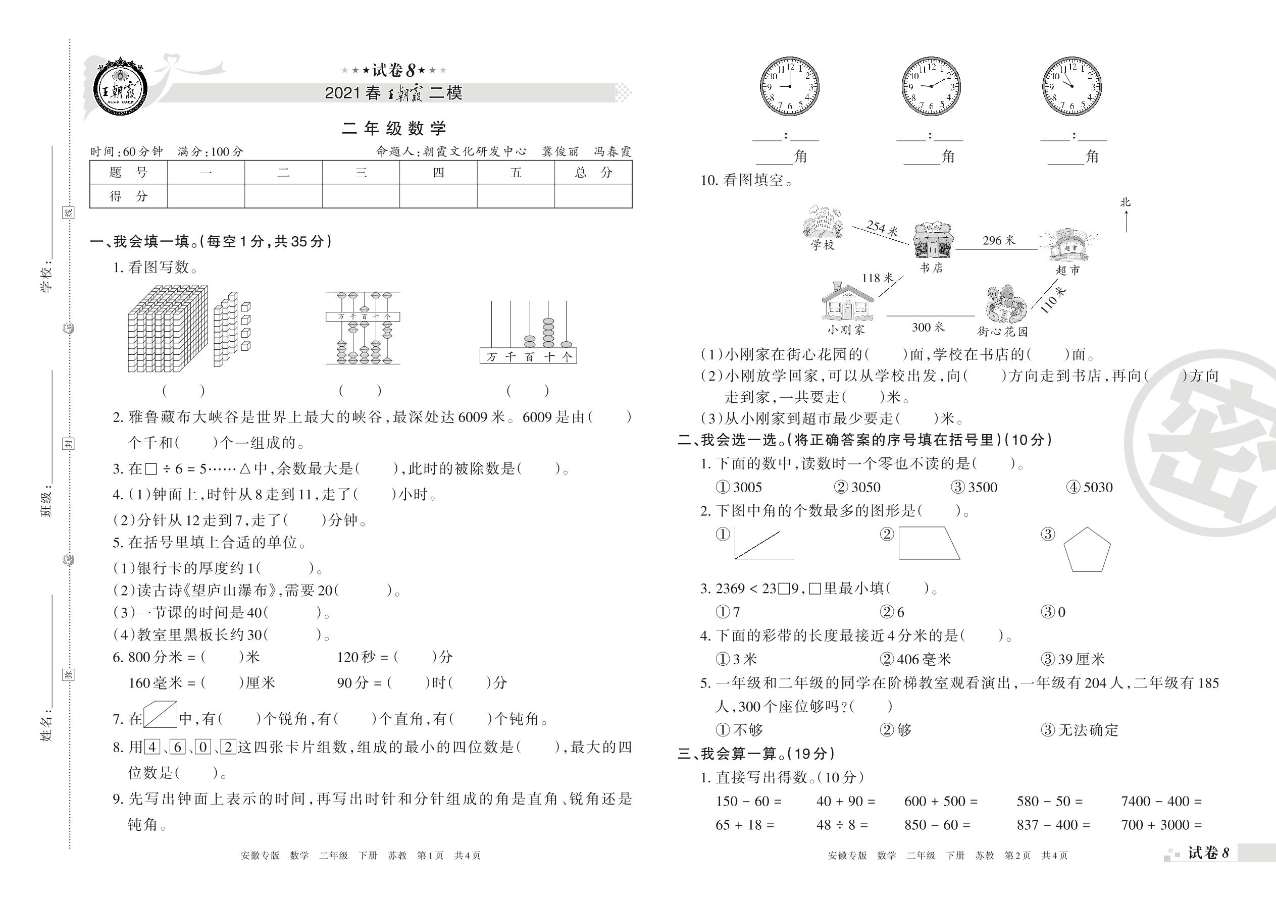 王朝霞期末模拟卷二年级下册数学(苏教版)_R21080382804【8】
