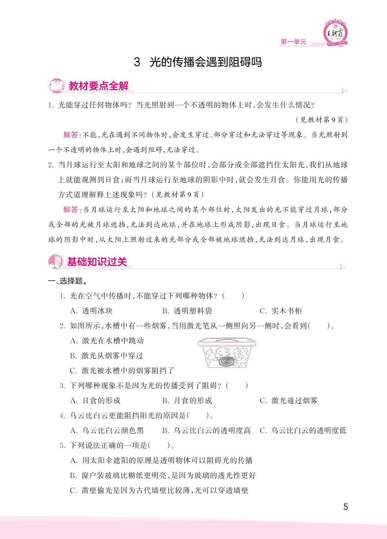 2023上册五年级科学教科版 第一单元 光——3 光的传播会遇到阻碍吗
