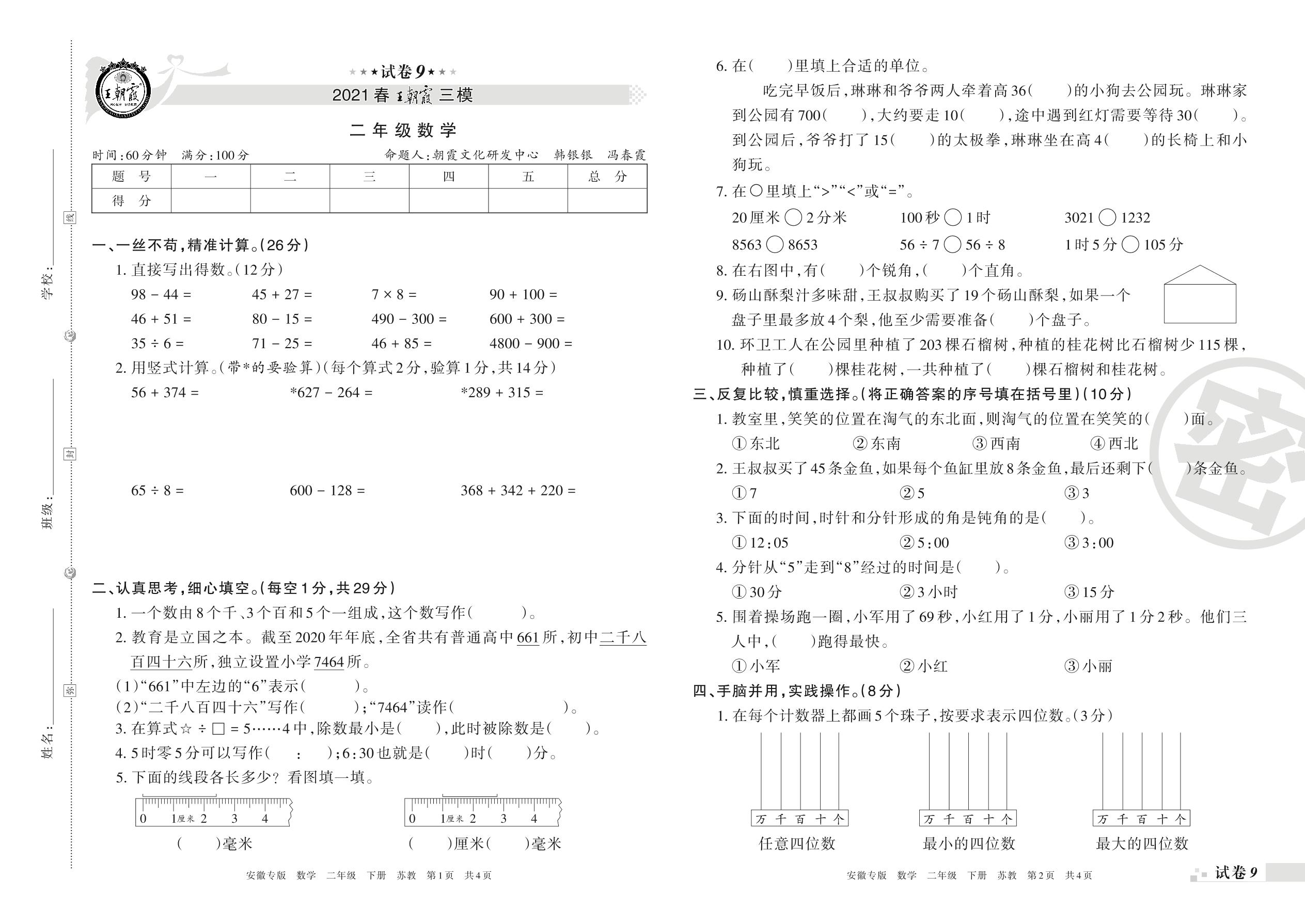 王朝霞期末模拟卷二年级下册数学(苏教版)_R21080382807【9】