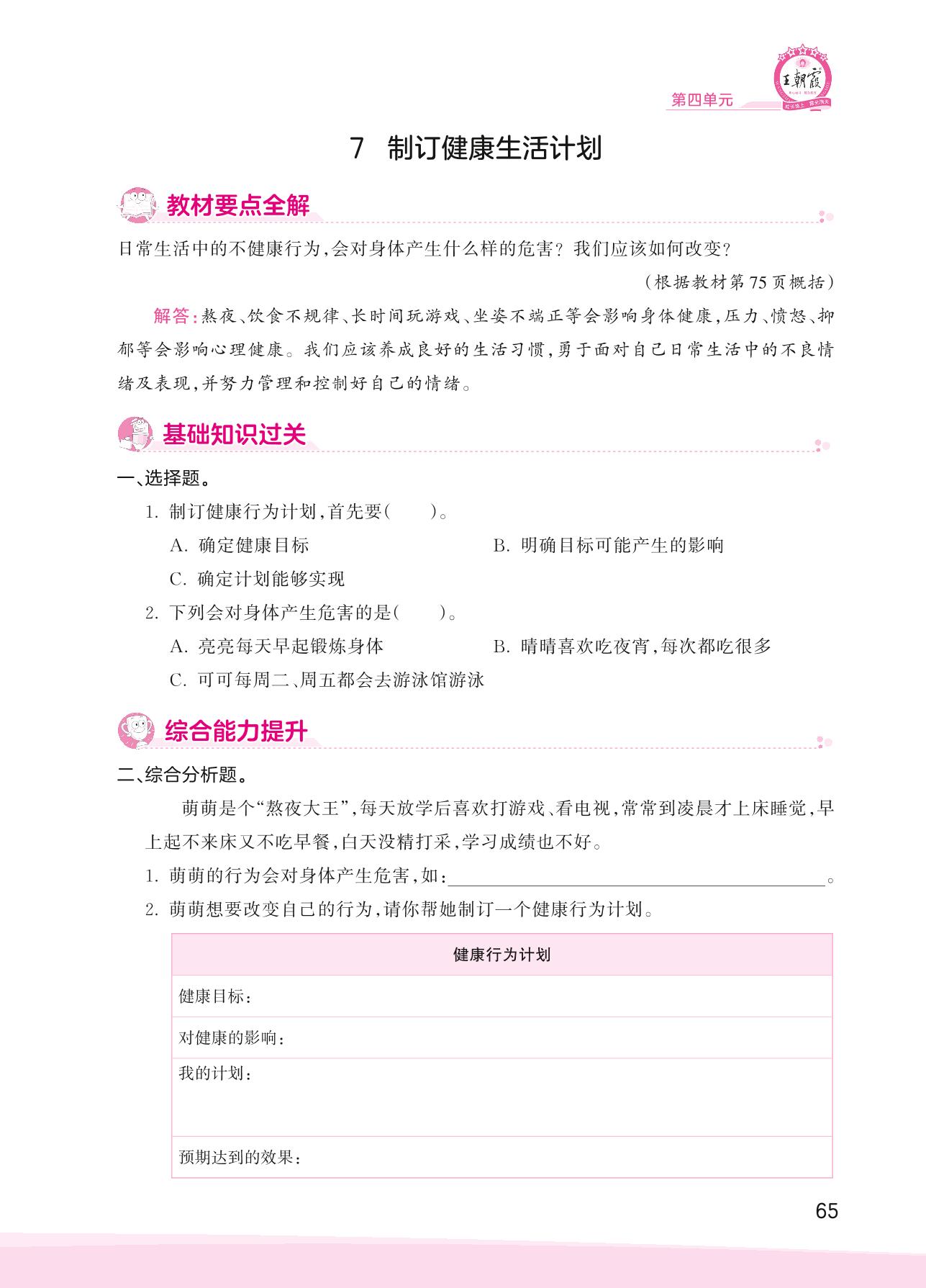 2023上册五年级科学教科版 第四单元 健康生活——7 制订健康生活计划