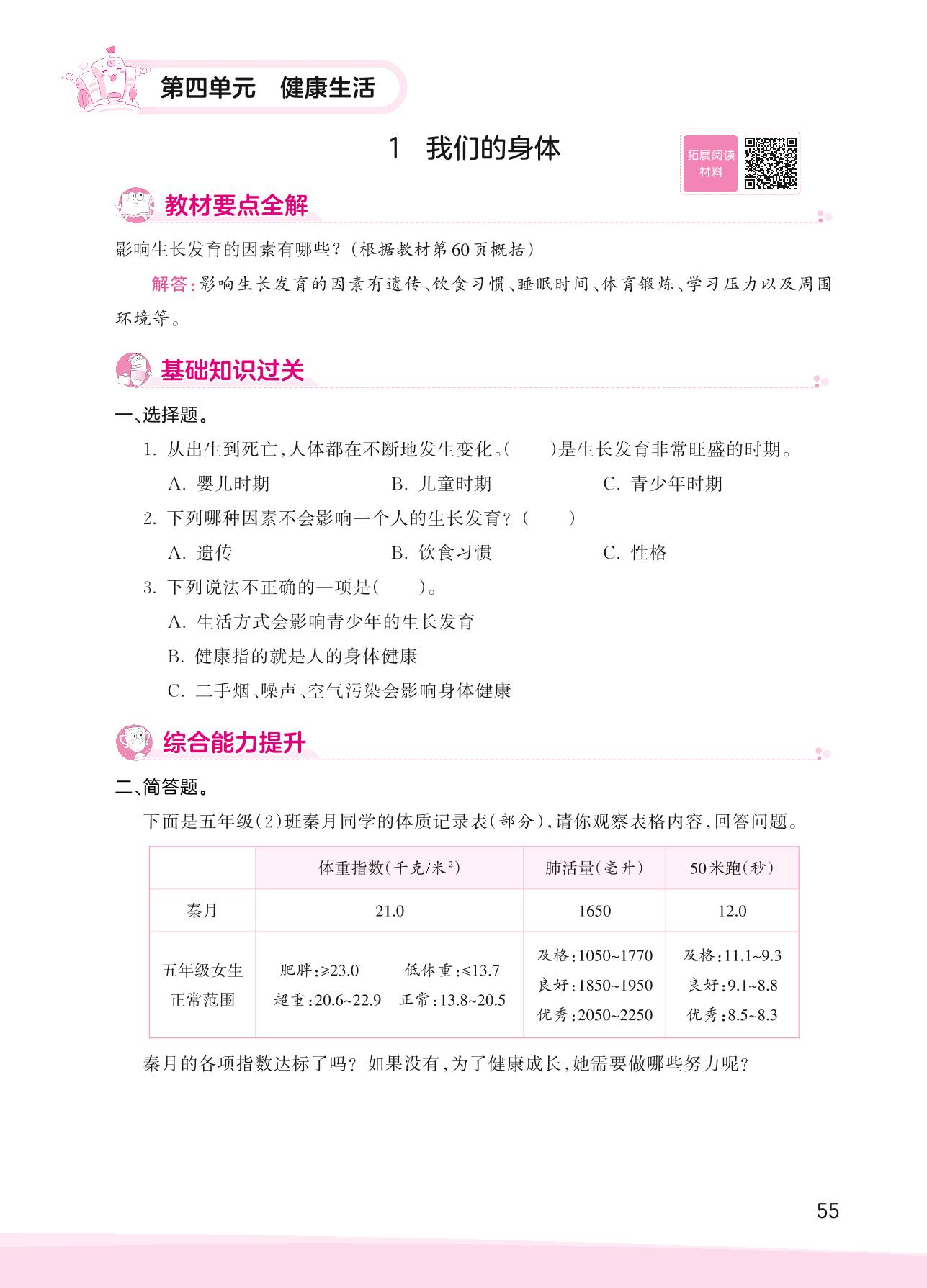 2023上册五年级科学教科版 第四单元 健康生活——1 我们的身体