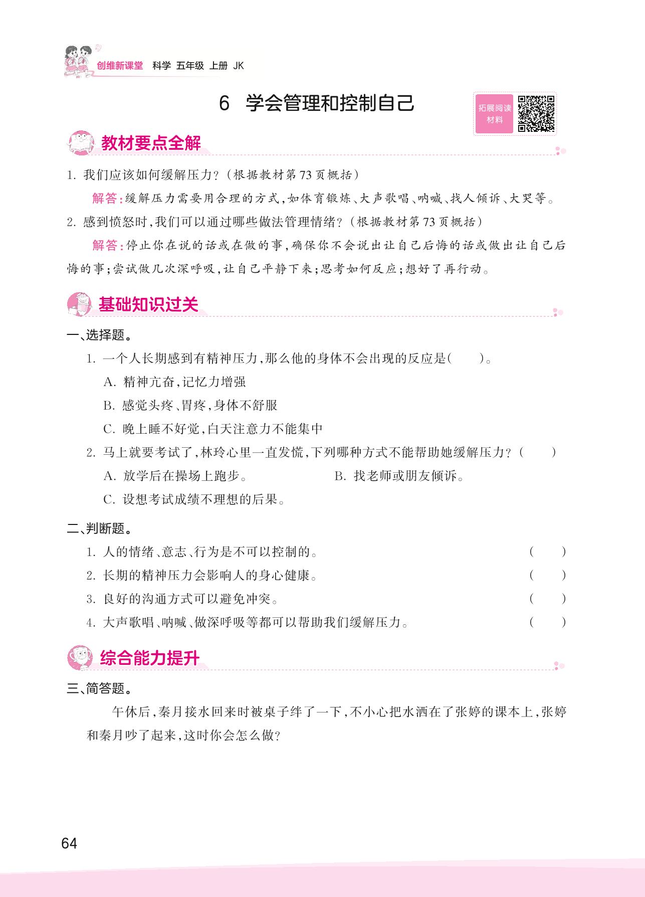 2023上册五年级科学教科版 第四单元 健康生活——6 学会管理和控制自己