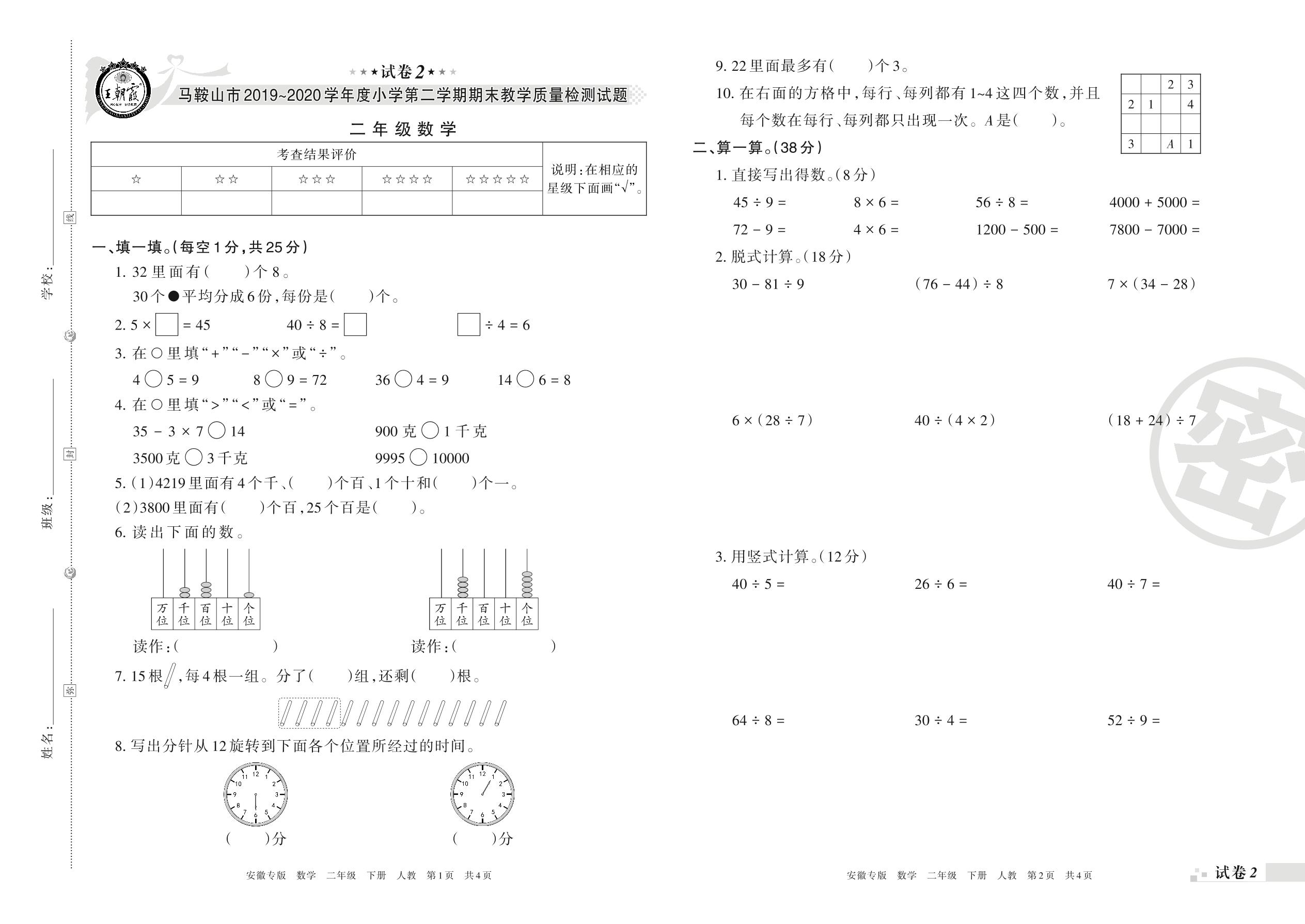 2019-2020学年第二学期马鞍山市二年级数学试卷(人教版)【2】