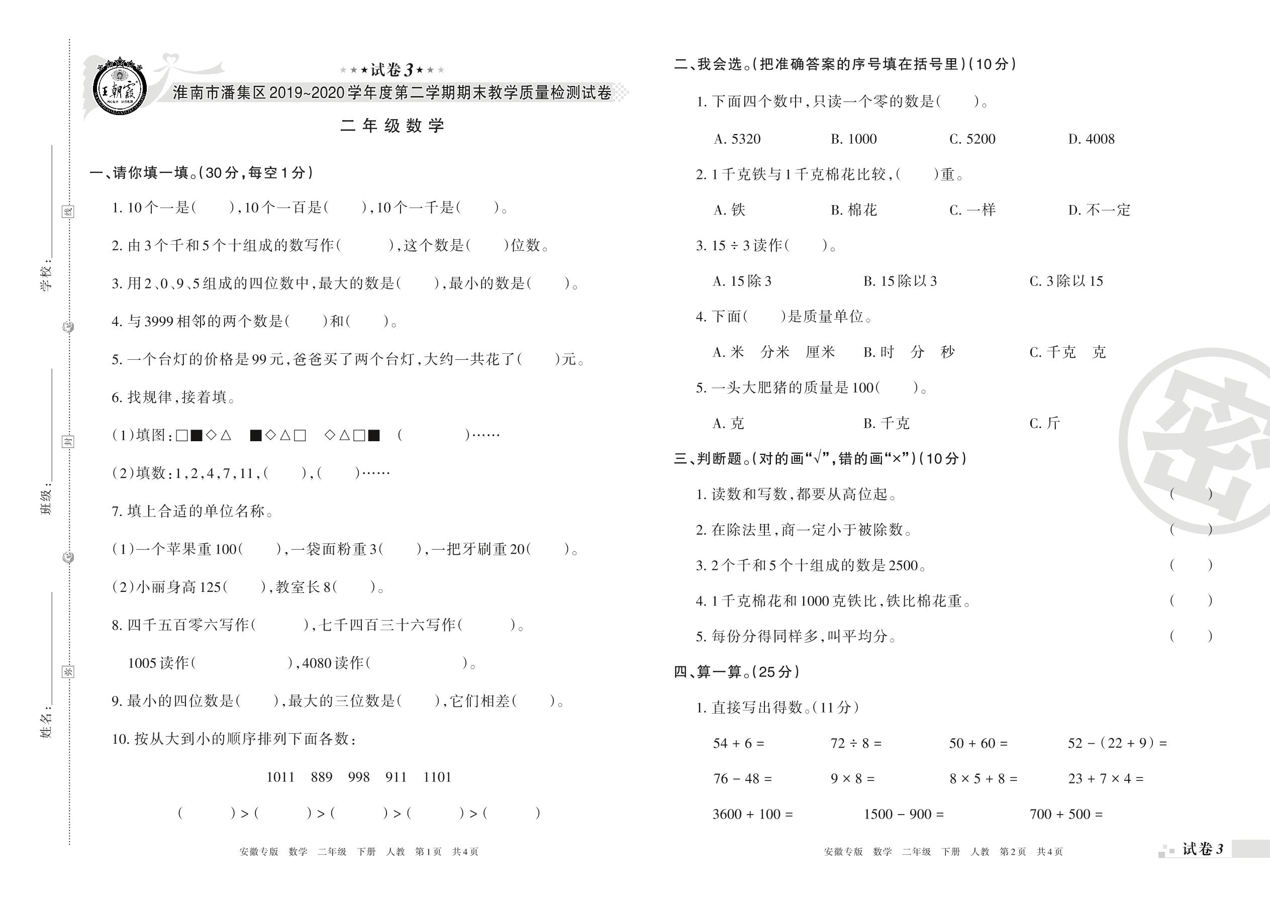 2019-2020学年第二学期淮南市潘集区二年级数学试卷(人教版)【3】
