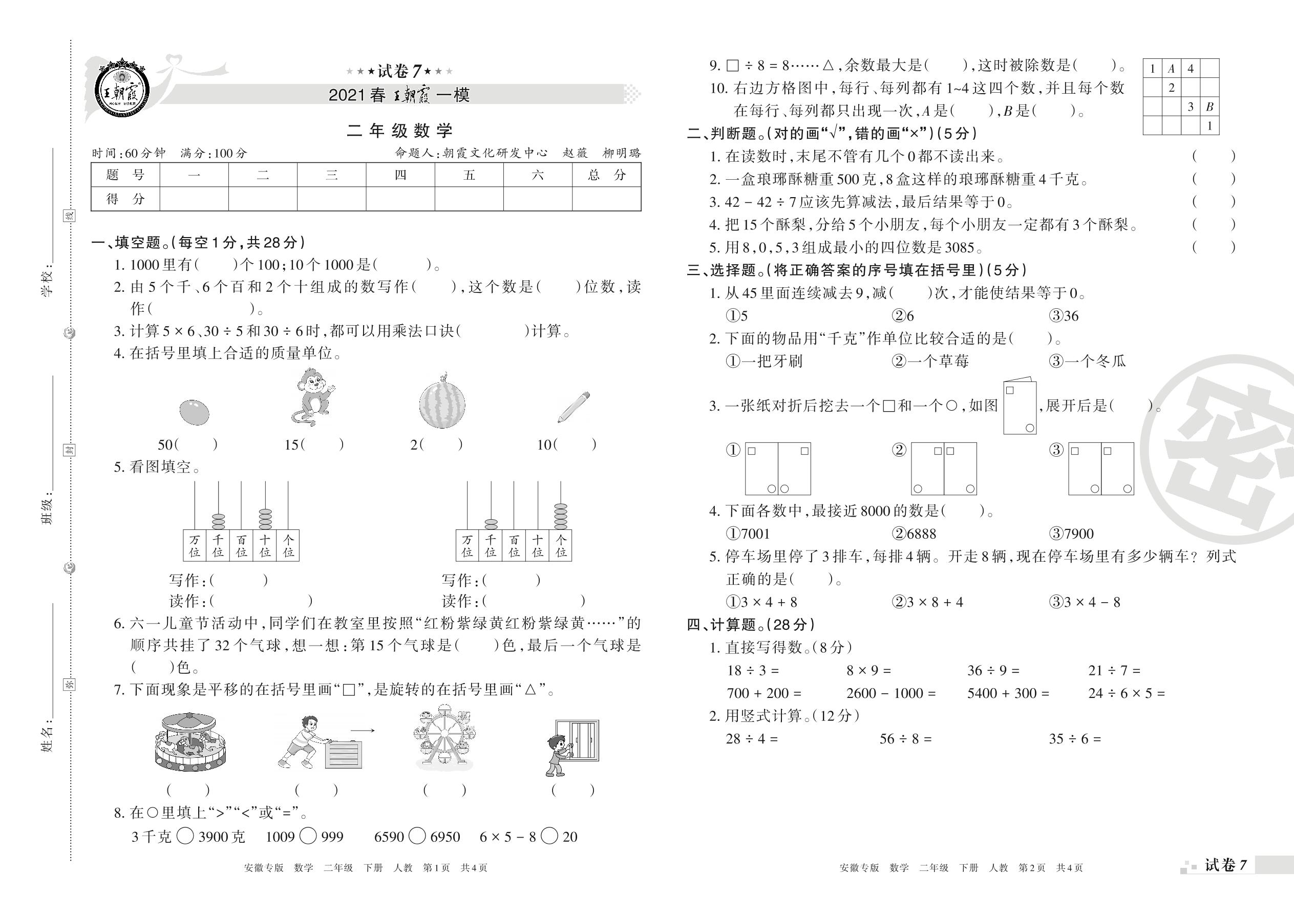 王朝霞期末模拟卷二年级下册数学(人教版)_R21080382854【7】