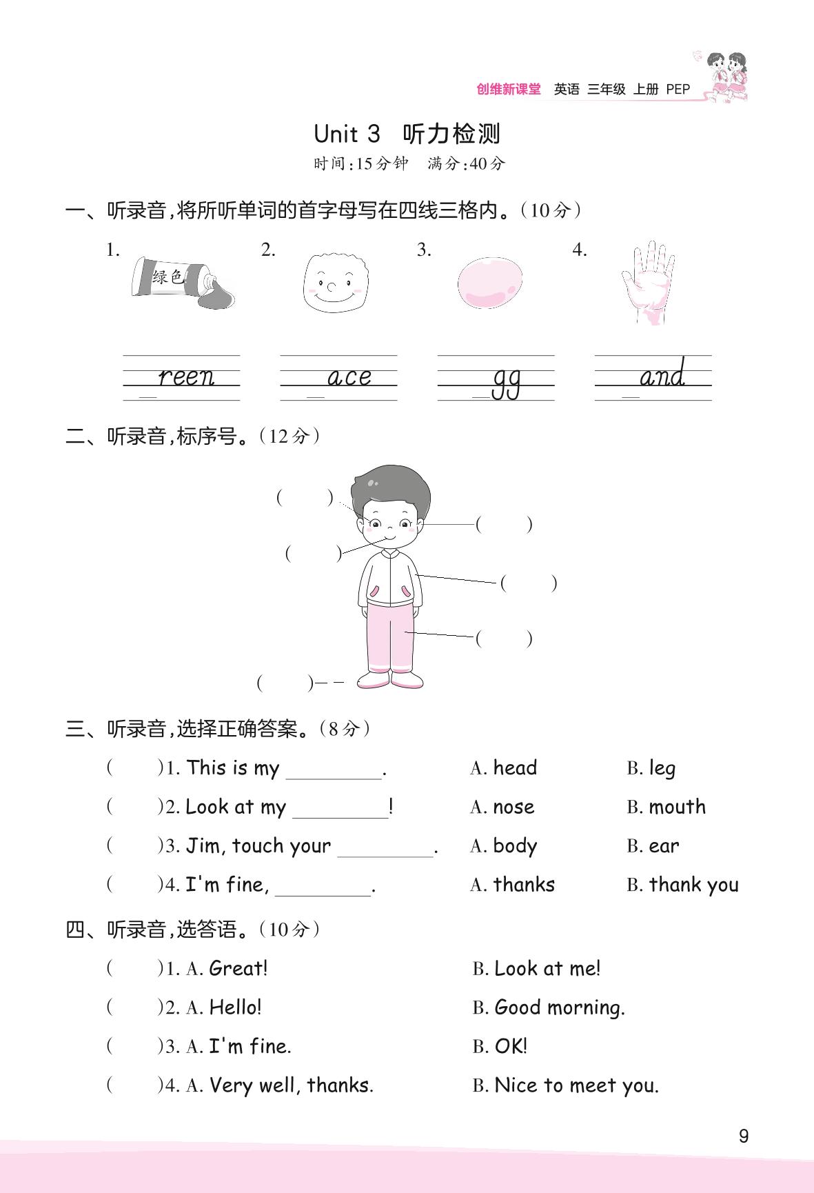 2023上册三年级英语人教PEP版 Unit 3 Look at me!—听力检测
