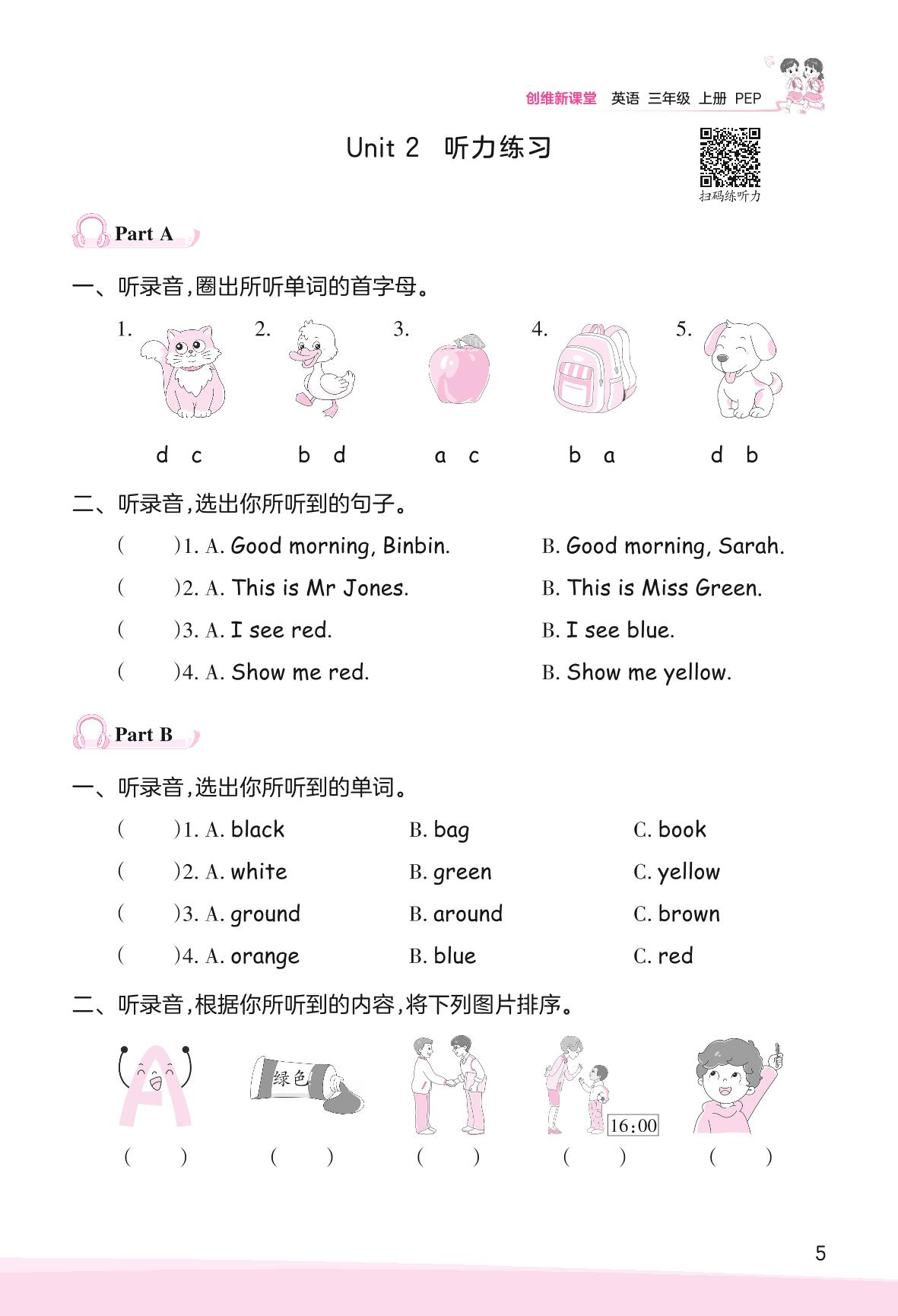 2023上册三年级英语人教PEP版 Unit 2 Colours—Part A、Part B 听力练习
