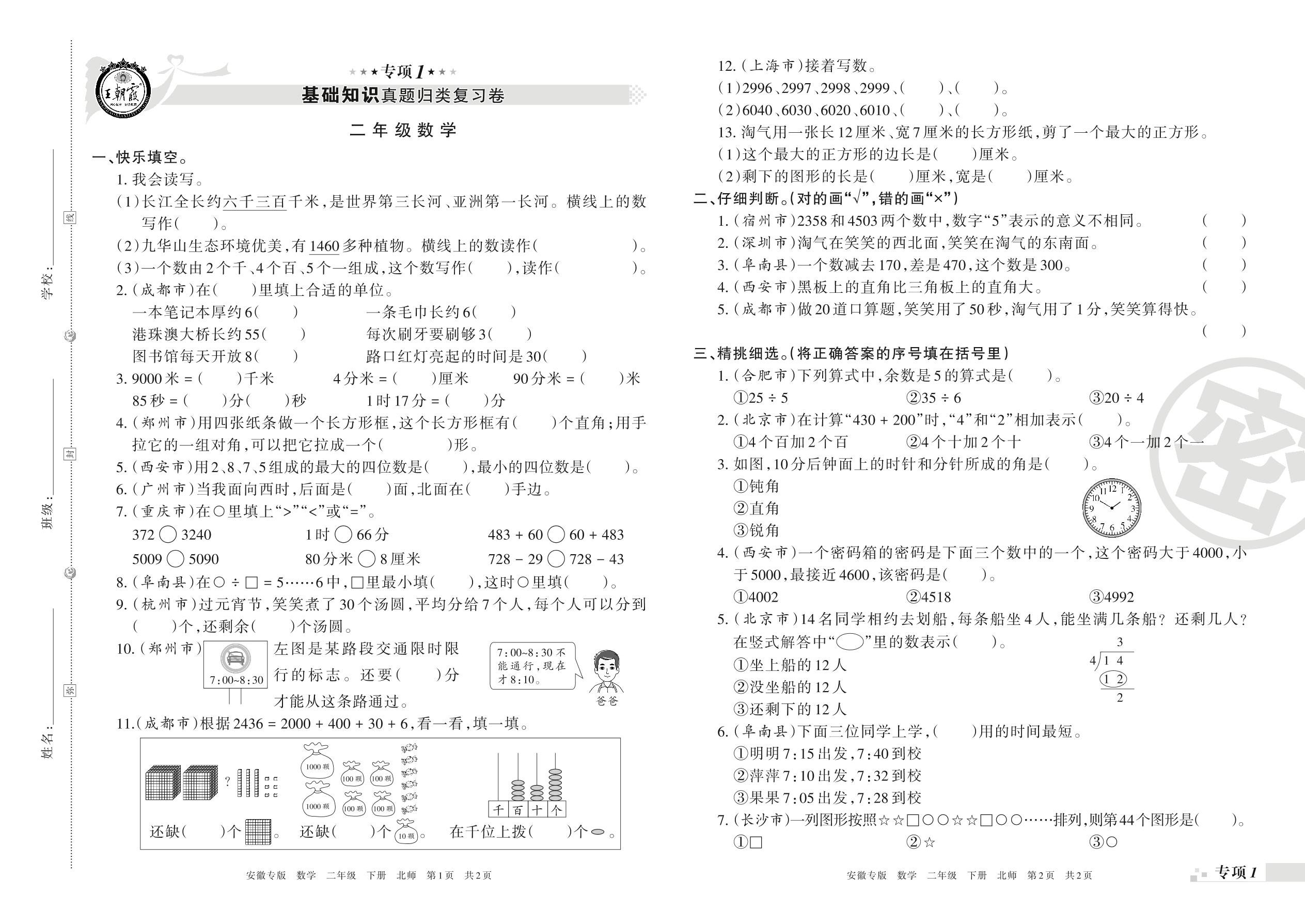 王朝霞期末专项卷——基础知识、计算真题归类复习二年级下册数学(北师版)【0】
