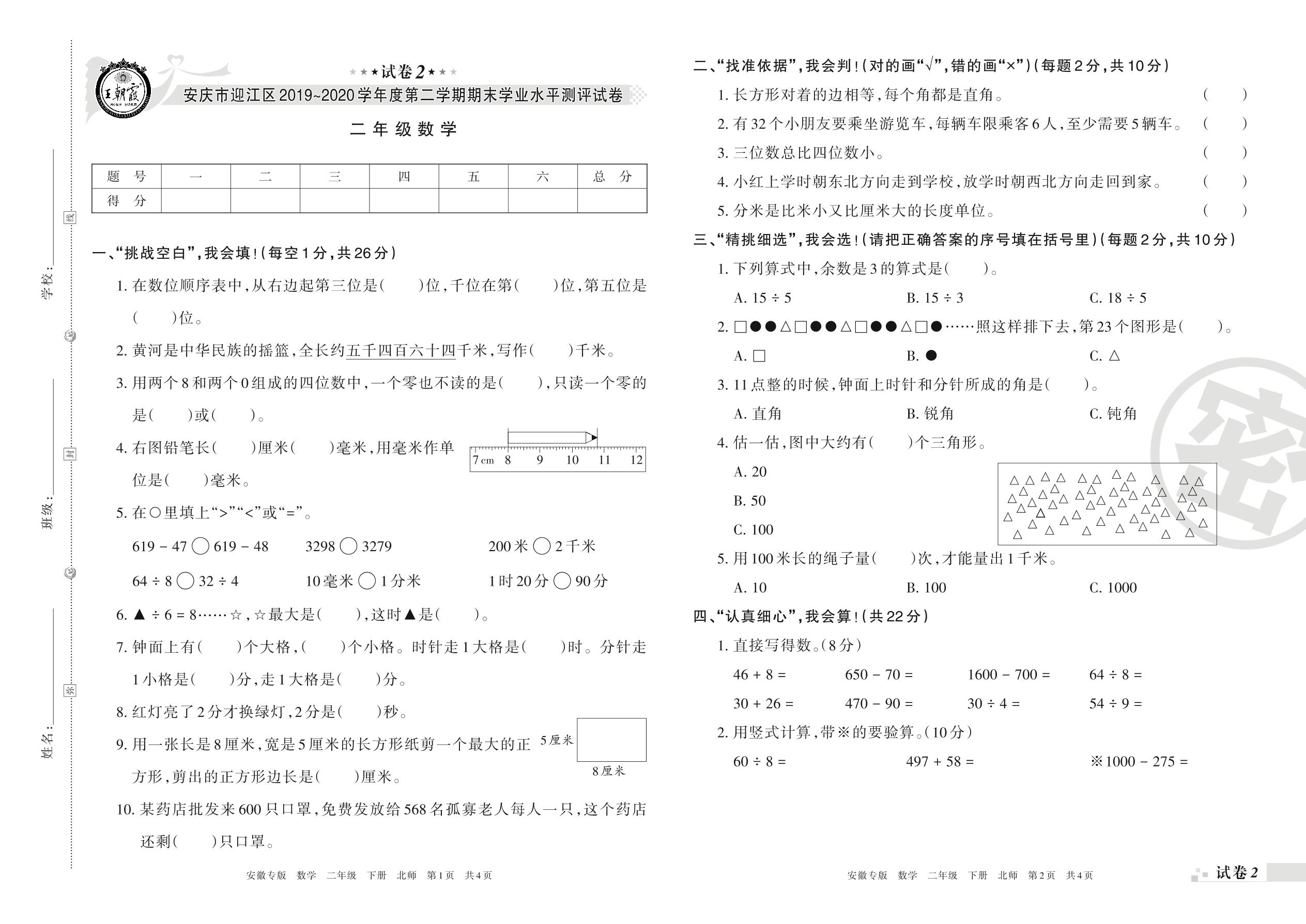 2019-2020学年第二学期安庆市迎江区二年级数学试卷(北师版)【2】