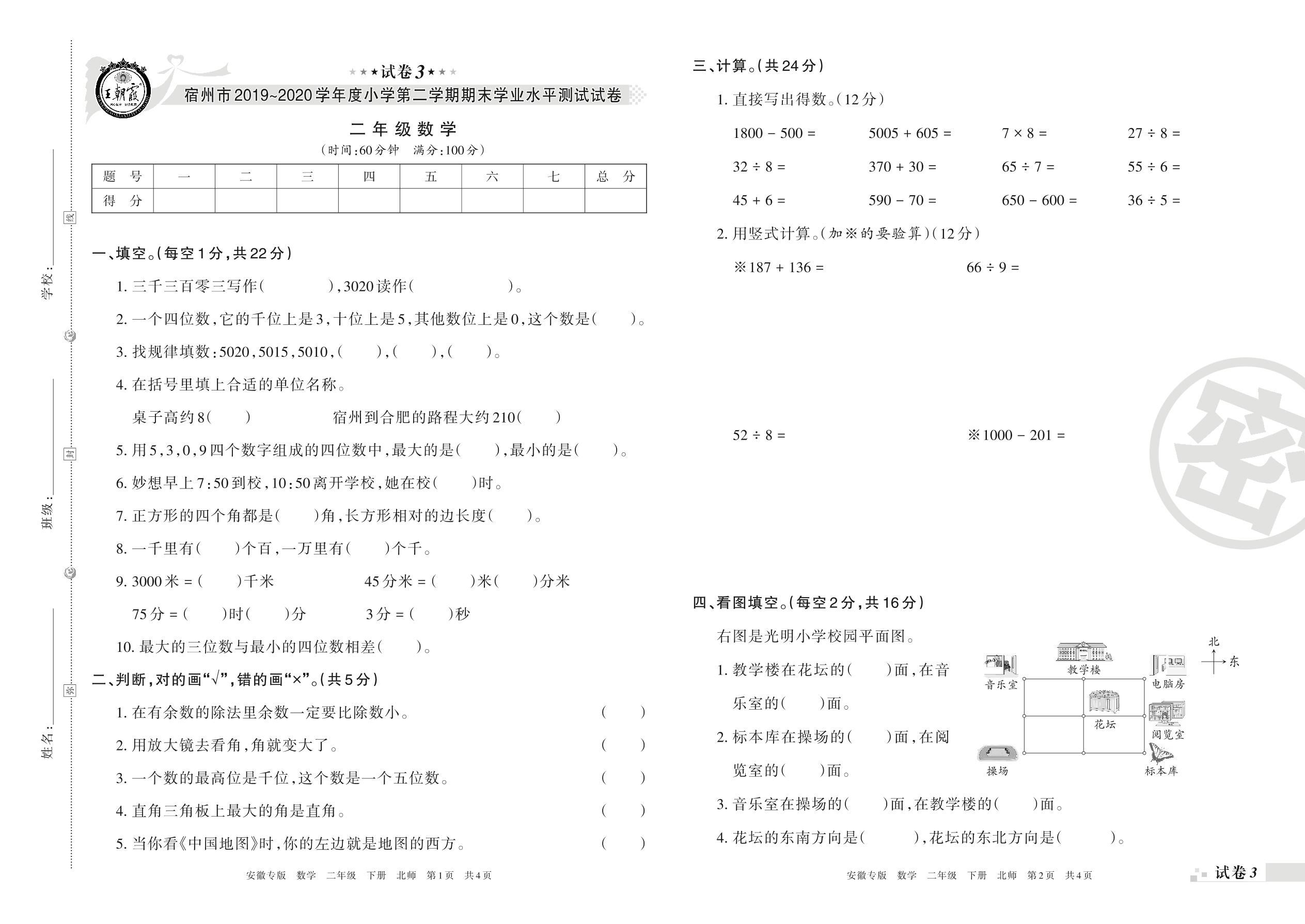 2019-2020学年第二学期宿州市二年级数学试卷(北师版)【3】