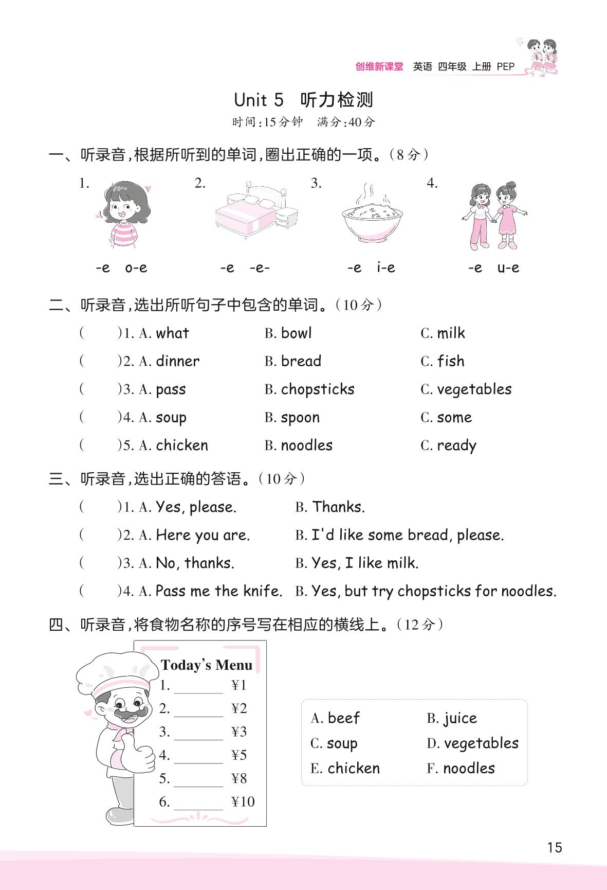 2023上册四年级英语人教PEP版 Unit 5 Dinner’s ready—听力检测