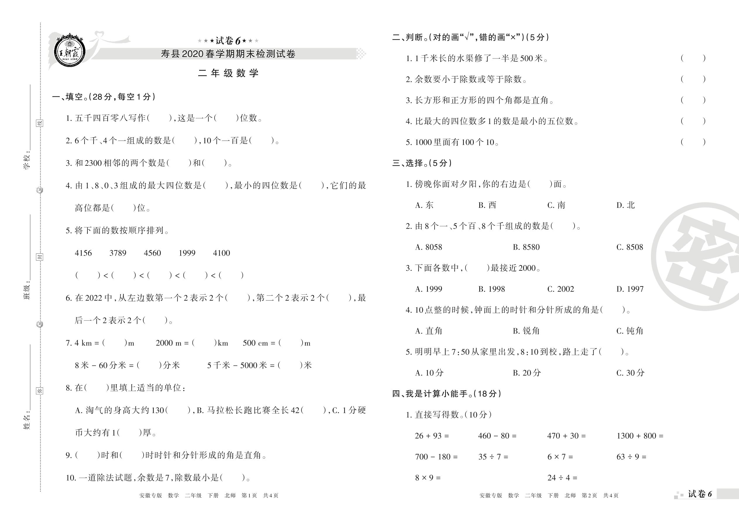 2019-2020学年第二学期淮南市寿县二年级数学试卷(北师版)【6】