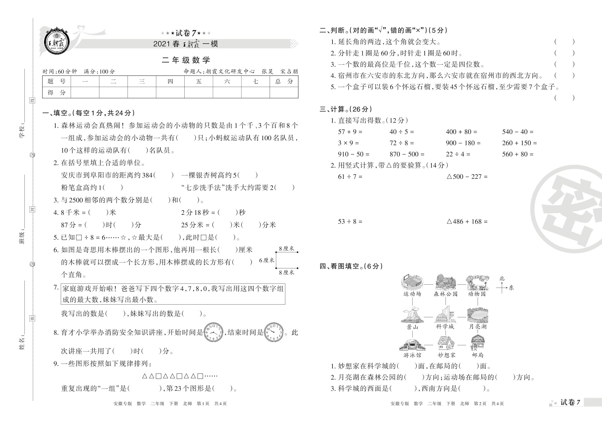 王朝霞期末模拟卷二年级下册数学(北师版)_R21080383007【7】