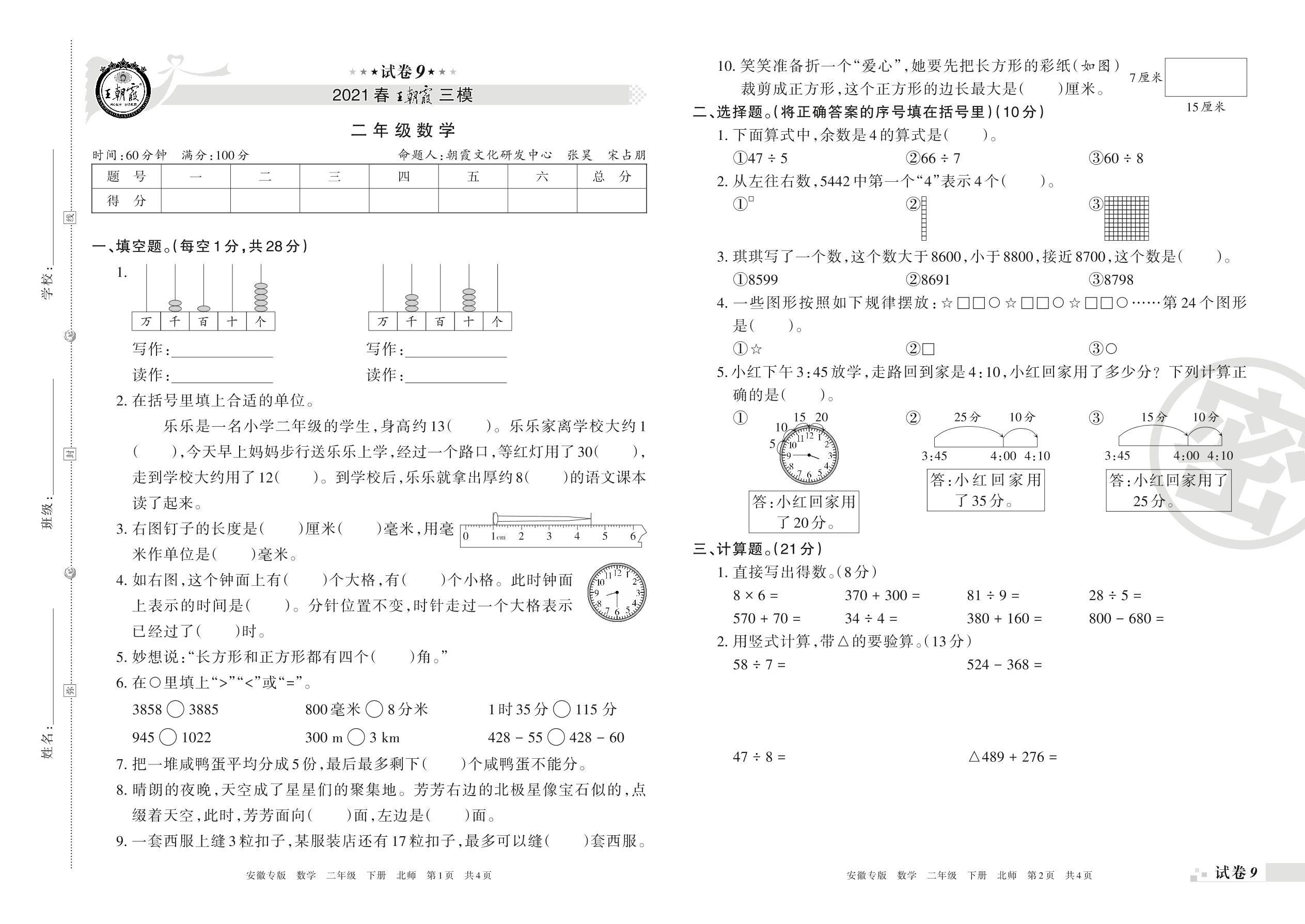 王朝霞期末模拟卷二年级下册数学(北师版)_R21080383015【9】
