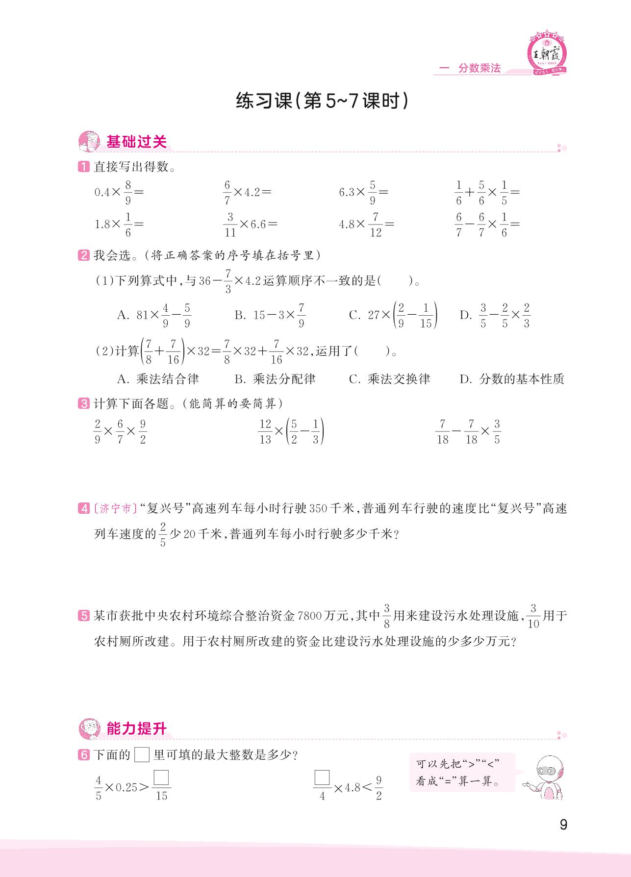 2023上册六年级数学人教版 一 分数乘法——练习课(第5~7课时)