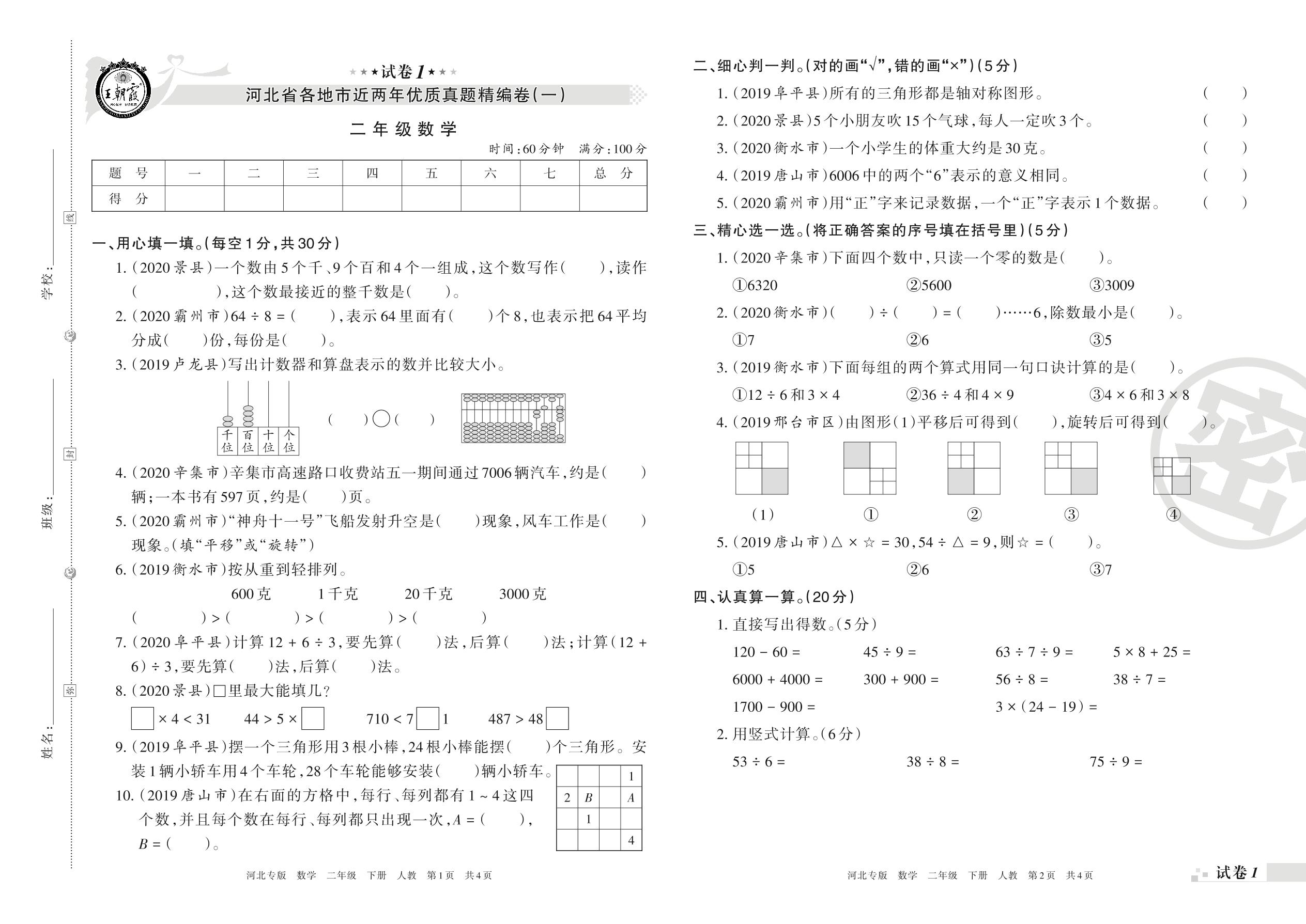 河北省各地市近两年优质真题精编卷(一)二年级下册数学(人教版)【1】