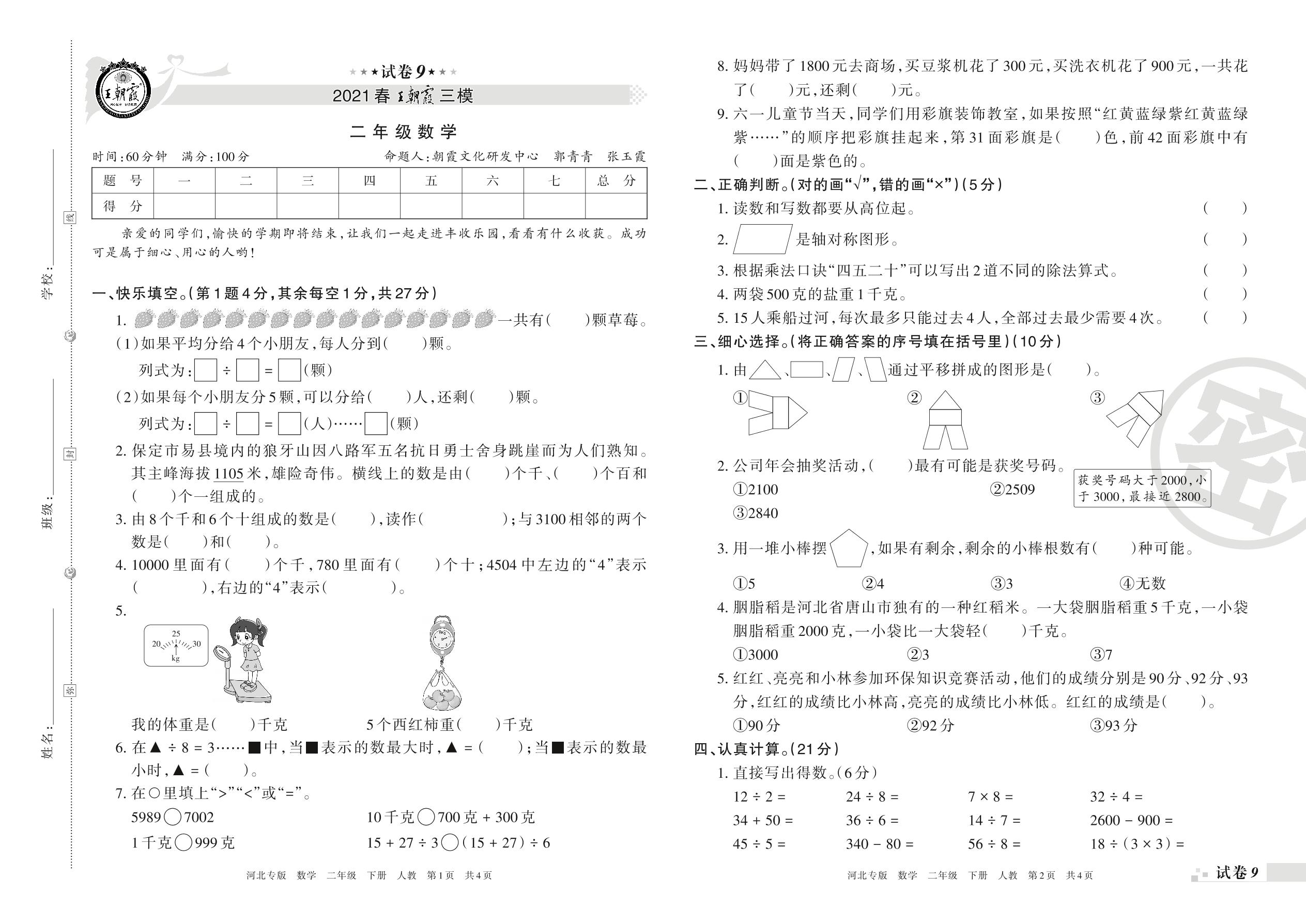 王朝霞期末模拟卷二年级下册数学(人教版)_R21080383113【9】