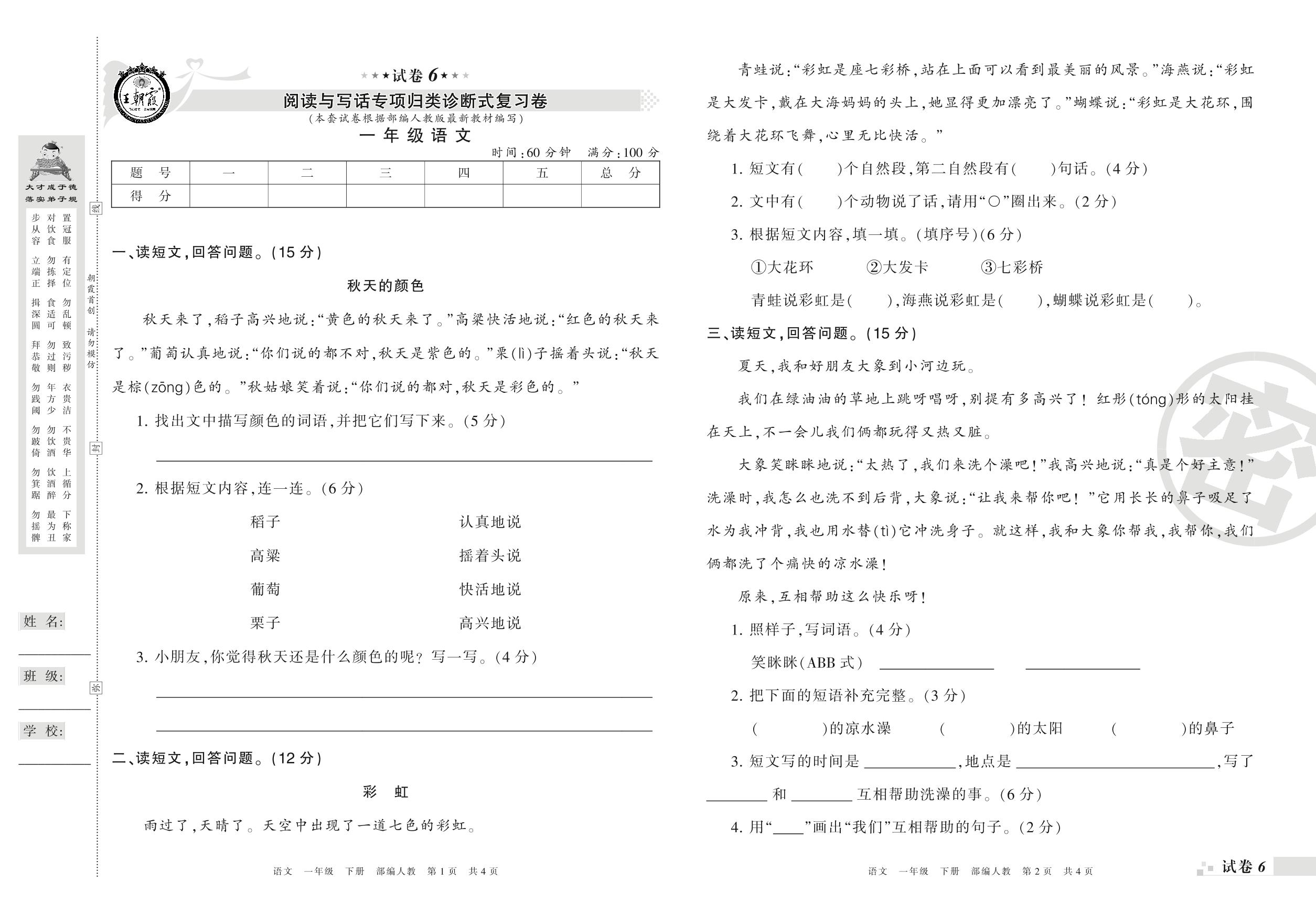 王朝霞期末专项卷——阅读与写话归类诊断式复习卷一年级下册语文(人教版)_R210731191028【6】