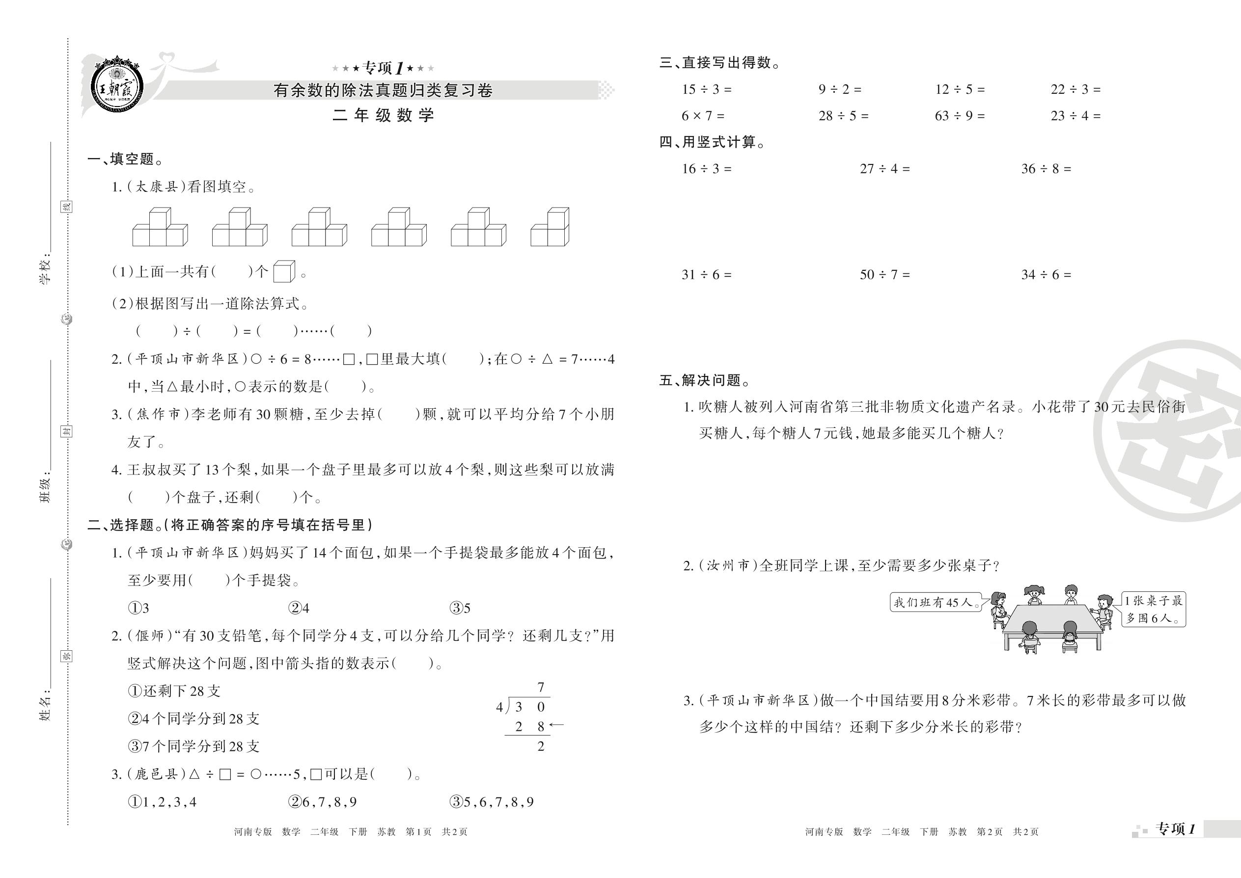王朝霞期末专项卷——有余数的除法、时、分、秒真题归类复习二年级下册数学(苏教版)【0】
