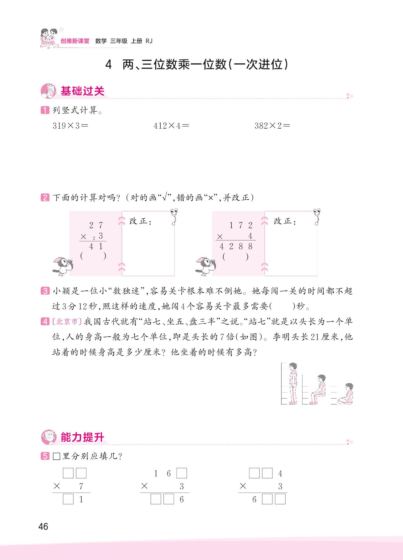 2023上册三年级数学人教版 六 多位数乘一位数——4 两、三位数乘一位数(一次进位)